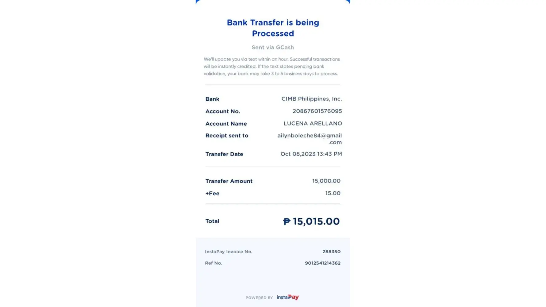 I send money to CIMB bank account name Lucena Zuniega Arellano with account # [protected] worth 15,000 on Oct. 08, 2023 13:34pm and 30,000 on same date at 14:15 pm for payment of purchased product on tasking job of Lazada Platform and another 24,000 to CIMB bank account name: Connie Garrido Cabrera with account # [protected] on oct. 8, 2023 20:43pm.