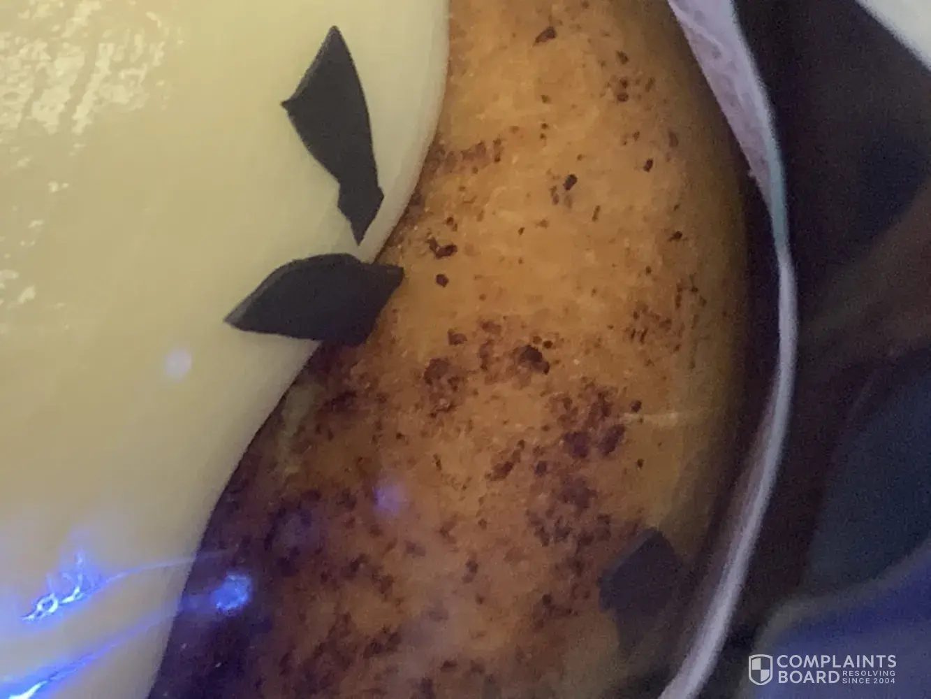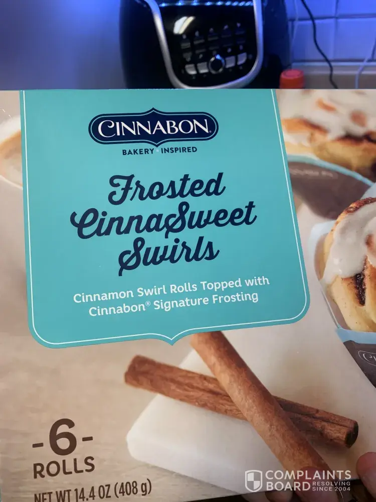 I purchased 2 boxes of them from my local Walmart for 9 something ( have the receipt )later that night took that box out of my freezer to defrost an eat to find black plastic pieces On top an around different Cinnabon's all inside under the plastic wrap that covers so the plastic was never opened so the only thing that got open was the box to take the tray out the pictures below will prove it shouldn't the packages be checked before boxed I'm very disappointed in this matter only because they really aren't that cheap to begin with then to have this happen so if someone could email back about this matter