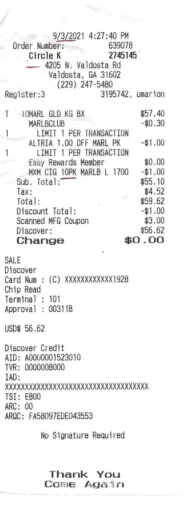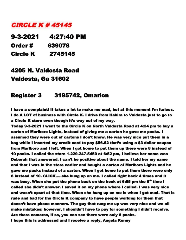 On 9-3-2021 I went to the Circle K Store In Valdosta, Ga. I attached the letter I emailed them three different times. I tried calling customer service, but all I do is sit and listen to music. They don't answer. On 9-10-2021 I went to another Circle K and asked them about who else I could contact. They told me the manager would be there the next day. I'm...