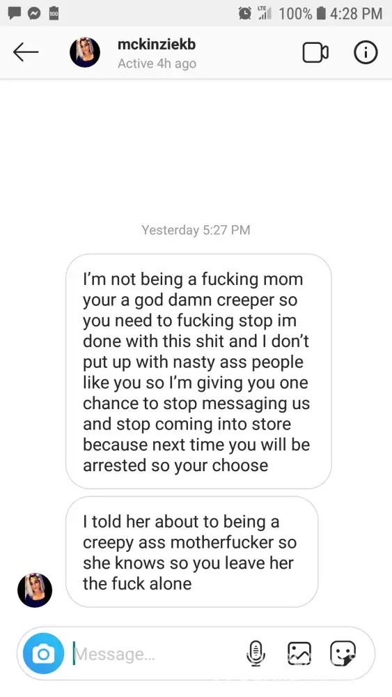 Makenzie bickford the assistant manager of your company told me to get the [censored] out of that store. She said that she would call the police if I did not leave. This was due to me asking for one of the employees names on Instagram. Makenzie has now spread rumor and false narrative about me and I'm now considering filing suit for libel and character defamation. I have a fleet of 5 vehicles that rely on your gas station because it is closest to my location and roughly spend around 1000 a month. I will be happy to take business elsewhere if she is not relocated. I do not appreciate being called out in front of other customers and if she has an issue then that's on her.