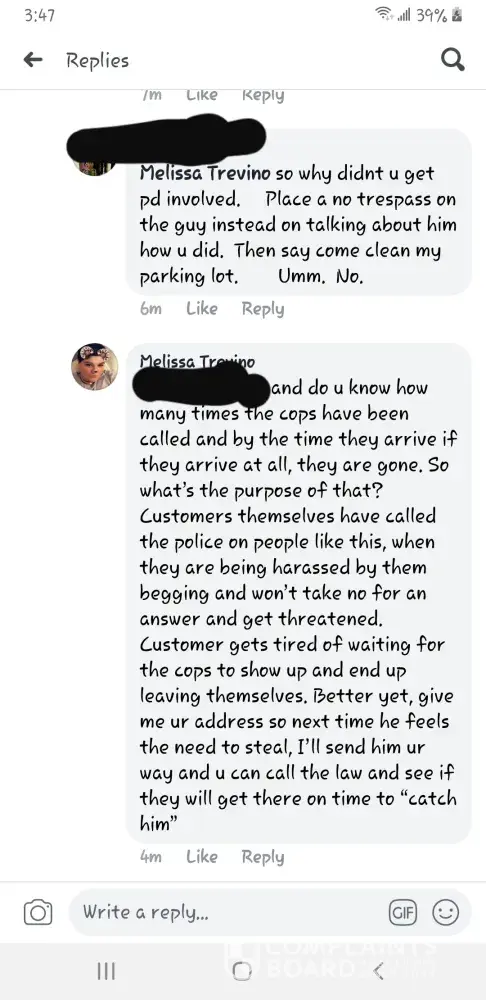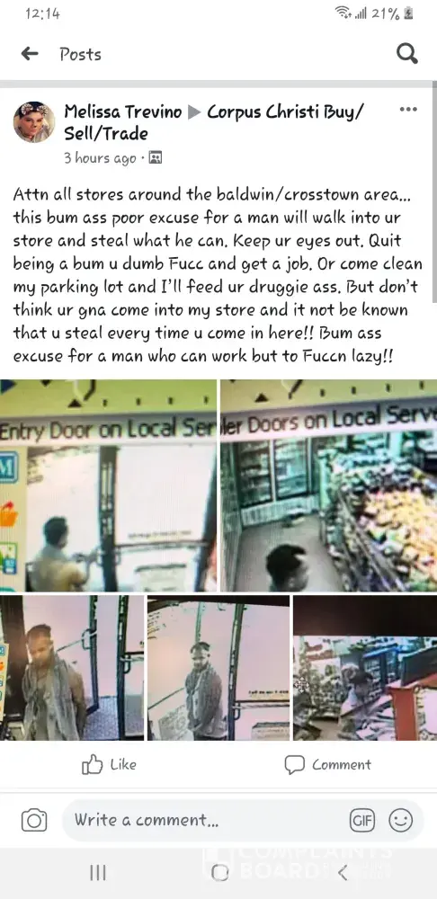 A store manager in corpus Christi is stating she will send a thief to a customer's house to steal his personal belongings because she made a Facebook post in which she was not supposed to make via Company Policies. Local law enforcement will be contacted and taken to her job to address this issue shes having with customers. Location Baldwin/Crosstown corpus Christi TX she is taking things to far now.