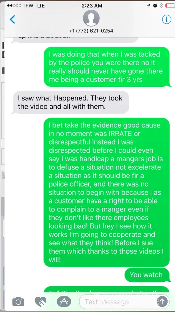 I'm a handicap 46 yr woman that was Brutalized by police on the 12 of September. Falsely arrested over a cup of coffe at circle k. Which the attending supervisor was the one that insited the quarrel walking into a conversation misunderstanding what I said n I wasn't even the one complaining. Police brutality in Port Saint Lucie has to stop. N the sad part was that I had 8 spasm attacks between getting arrested n at the county jail and did nothing to aid me! I'm suing circle k, the police department and the county jail! All which is on video! From the store to the dash cam to the county jail. The treatment was worse there by white officers n the nursing staff in initial intake! This is all so sad I feel voilated n disrespected felt like I was treated like an animal. They had no charges so they trumped up charges! I have never been in trouble with the law I'm a military spouse my husband currently serving this great nation for 20yrs had to help me from across the world to bond me out so I can immediately go to the hospital for emergency care! I am disabled I have degeneration of the spine 7 herniated disks, osteoarthritis in my hands knees and lower lumber abd wrist. I couldn't resist arrest even if I wanted! My body wouldn't allow me, n they thought I was resisting them n I kept screaming on the top of my lungs I'm disable please stop your hurting, but that only made them slam me harder into thier vehicle n dig his whole forearm into my face n neck, blood shotting my eyes from the pressure applied they kept saying I was screaming at them yes your violating all of my constitutional rights n I'm partial def I can not hear myself speak so I tend to talk louder because I can't hear myself speaking! It was all so unprofessional n disheartening because aren't police suppose to defuse a situation not escalate it? Aren't they suppose to hear both sides? Never mind that I've been going to this circle k fir 3 yrs almost 4 everyone there knows me by name. Jackie they call it's my nickname n I have never been IRRATE or disrespectful to any of them at anytime instead very helpful, if you look back in their video history you will see I come in every day to that store n always leave them laughing with a smile a very loyal customer, n just like that the supervisor Kim whom by the way every morning reeks of liquor came in an assumed I was the one complaining when it was other customers in the store n I was coming to their defense saying they new n working on getting better, n the manger Christina was behind the register, suddenly became quiet n Kim accused me of bad mouthing her employees n literally told me to get the [censored] out the store Christina stood there n allowed all of this to go down knowing the truth she was afraid of speaking up and losing her job! I have texts which she dared to send me, as if I'm suppose to understand that there was nothing she could do! Had she told the truth none of this would have happened I have photos videos n medical reports of the contusion to my right wrist n spine! All because another customer said the coffe had been bad in the last few days! I go to jail! N even if I did voice my opinion am not suppose to speak to a manger and supervisor n bring that to their attention? If not them, then who? And again I wasn't even complaining which makes all this so sad I was actually defending them n Kim walked into a conversation under assumption without facts n called the cops on me over that! This same store has targeted many people almost every week out this same store police Harassed customers just sitting in front of store in their vehicles. Police are suppose to protect n serve us tax paying citizen n not guarding n protecting just business in the community they suppose to give someone an opportunity to speak n say what they need to say as much as the complaining party both sides of the story, not just accuse me assume me guilty n now I must prove my innocence none of this warrant it an arrest which lead to an illegal search n seizure of my property in which they found 0.04 gram of marijuana which I have a medical marijuana card and I'm disabled, here a the trump charges resisting arrest with no violence!