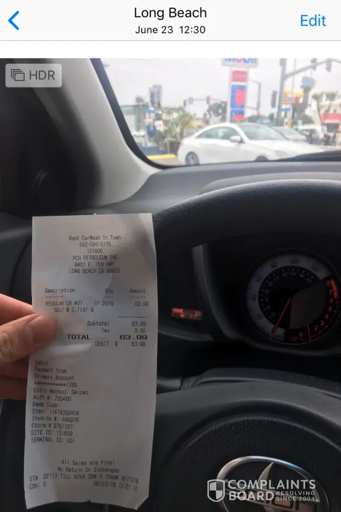 I stopped at this gas station about a month and a half ago to get gas and the pump had a severed fuel-line that wasn't roped off. I started pumping gas normally and became concerned when the pump didn't auto-shut-off at the $30 mark (I drive a Scion xD and it usually takes about $30-$40 to fill from completely empty). I disengaged the pump and the pump continued to "pump" the gas. I became concerned that gas was going to leak everywhere, so I ran inside and informed the attendant who told me "the line was just severed, I haven't had a chance to rope it off so just remove the nozzle". I ran back outside and removed the nozzle and he was correct; no gas leaked anywhere. I checked my gas level (pictured below) and confirmed that no gas made it into my tank. At this point, the charge made it all the way up to $63.99 for gas that I didn't receive. I went back inside to get a refund/use a different pump, but the attendant informed me that "only the manager can perform pump refunds". I told the attendant that I lived in Northern California (about 6 hours away), and he said to call back on the following Monday and the manager would refund me; no problem. I called back per his instructions, and the manager told me that he was aware of the severed gas line, but that Circle K and Exxon Mobil did not allow him to make refunds over the phone. He informed me to call around/dispute the charge with my bank (which I did), when my bank told me that the merchant must refund me the amount. I called the manager again to tell him this, and he gave me another contact to call (Exxon mobile). Exxon mobile told me that they only supply the gas, and that Circle K or the manager must perform the refund. I called the manager back, again, and told him my findings. He told me that he would call Circle K and process the refund (1 week ago), but still hasn't done so.