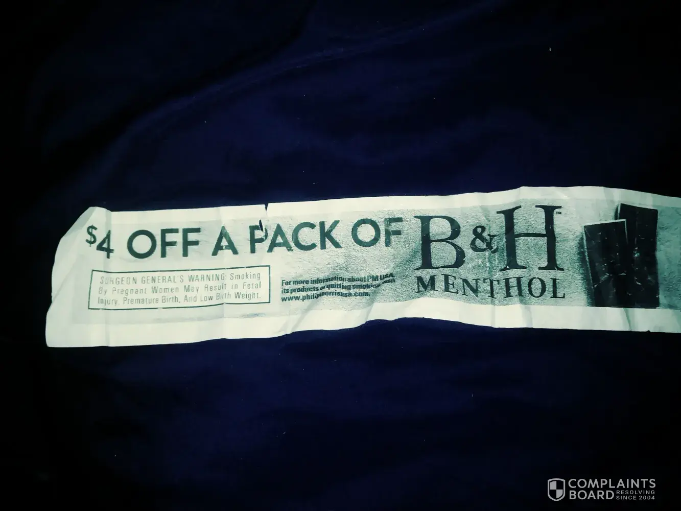 I recieved a b&h cigarette coupon for $4 off a pack of b&h menthol ciggarettes and i went to the store the coupon experation date on the coupon i have i 05/02/2018 they told me the coupon was fake and not every coupon rings up on Theyre register so when that happens they can not except it at all.i think this is crazy due to the fact that i recieved this coupon from the same store i went to to purchase the ciggarrets at.this was a huge inconvience and im very upset considering the fact I do not drive and i walked 2miles there and back. How can you refuse to accept a coupon from your own store