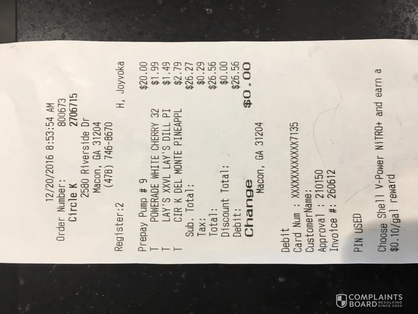 When asked, I expressed to the attendant named; (J. Ashleigh). A very light completed, african american - adult female, about 5. Ft 5 in. Tall, shoulder length black hair, large round eyes. That I would like [2-berry & 2-wood-tipped blk mld jazz. I reached in my sock to get a $20.00 bill and handed it to her. However, I decided to use my visa card to make the purchase. She opened her register, then closed it, gave me my receipt, but kept my $20.00 bucks. She told me that if I have a problem with her, I could call circle k corporate office or return in the morning and talk to the store manager. She also, would not give me a contact phone number to do so.