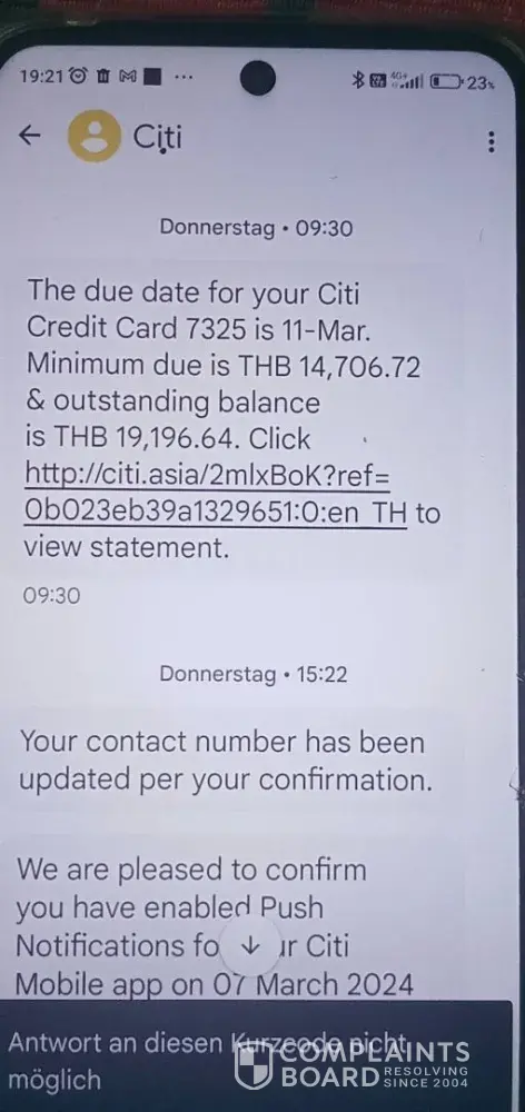 Since 20. feb my Card was temp. cancelled bec of overdue date although I had sufficient fund at my Bangkok Bank from which Citi automaticly debit the outstanding balanc, and this was perfectly working for about 20 years I am a CC customer. I was in no way informed either by sms by which I usuale get any news from Citi nor by phone! I sat in a foreign country and CC did not work, what a horror! Requiring infos by e-mail did not get any clear answer as it only said "we are working on it"But in the meantime I received countless calls from citi but when I answered and asked for english the respond of the staff were always "no english" and closed the phone without any further infos, no bye no good day - unpolite and uneccebtable behavior of a staff of a worlwide operating CC Company! I had no chance to talk even one word. The same experience I encountered when I called [protected] no english speaking staff and when my wife called again and staff saw my phone number they opend and closed with any comments and on a further call even did not answer at all! I was very shocked and truly upsat and at loss by this unbelievable treatment of a CC Customer! After a lenght searching by luck I found 66 [protected] and by help of my thai speaking People, bec the operator also did not speak english, and after a lenght reconnection I was finaly able to speak to an english speaking staff. After much enquiry he told me to go to 7/11 to pay my outstanding balance which I did immediately today 12.03 at 10.33 thai time. The amount of due balance was 14,706,72 thb and due according to Citi sms on11.03 but it was again not debited from my Bkk Bank account therefore I went to 7/11 and paid all the outstanding balance of 19,196.64 THB. I was told by a staff of citi after paying the due balance the card would be Valid immediately but after using the card it was still cancelled and by contacting Citi CC was told it takes 24 hours to reactivate, I was wondering why so long as money transfer from one Bank to another one in Th is done in seconds!