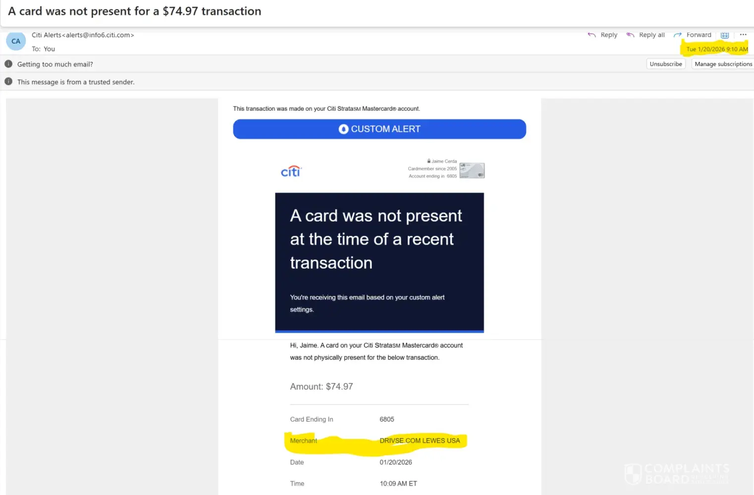 I’m deeply disappointed with Citi’s handling of a clear case of fraud on my credit card. A $2,800 charge appeared that I did not authorize and cannot trace. Rather than investigating properly, Citi has refused to provide any documentation or evidence supporting the charge, effectively accusing me of dishonesty simply because I don’t have a receipt for...