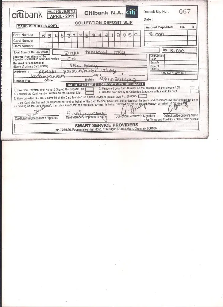 I have Using your CITI bank Credit Card since 2007. (CITI Bank Credit Card No. [protected], in the Name Of R.Veluswamy). But i Couldn't make the payment for the last 2years i have explained my suituation to their executives and manager's, they planed and offering me to settlement of for Rs. 8000/- on 10/05/2010.(here i have attached the settelement Letter copy, pls find the soft copy), i made the payment on 11/05/2010. (here i have attached the bill payment copy, pls find the soft copy). and now i have received the a statement like received cash payment of Rs. 8000/- on 12/05/2010. and still showing payment over due pending...