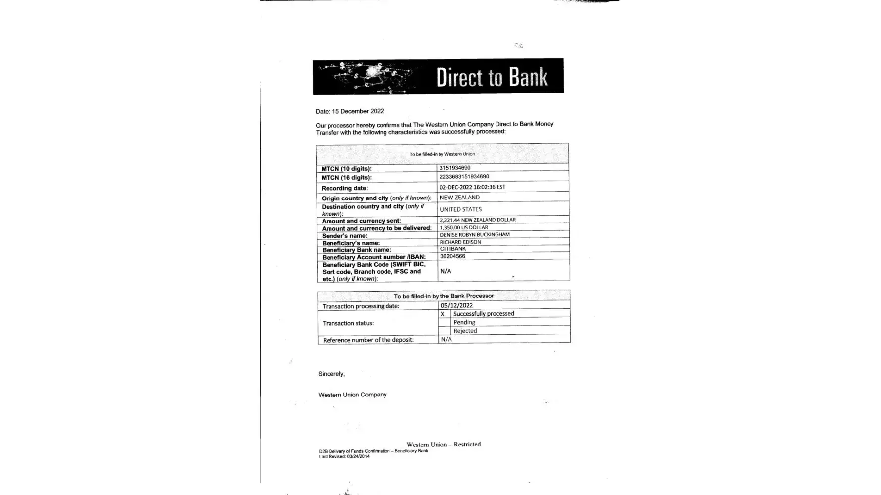 On December 3, 2022 I lodged through Western Union a deposit of $2225.44 to be paid to Account Number [protected] at CITIUS33 111 Wall St, New York, NY 10043. Western Union claim that they sent it through to Citibank on December 5 (I have proof) and yet Citibank has never deposited it into the recipients account and are claiming that they never received it, The recipients sent me a letter explaining that they had never received it and Citibank claimed they had never received it. I am out of pocket for this money and have had to raise a loan to replace it, As I am in New Zealand and don;t have a citibank account I am unable to communicate with them and have even written to their customer services in Puerto Rico who didn't bother to reply. Western Union are standing by their claim that they sent it and are refusing to refund me the money until Citibank pay it back to them.
