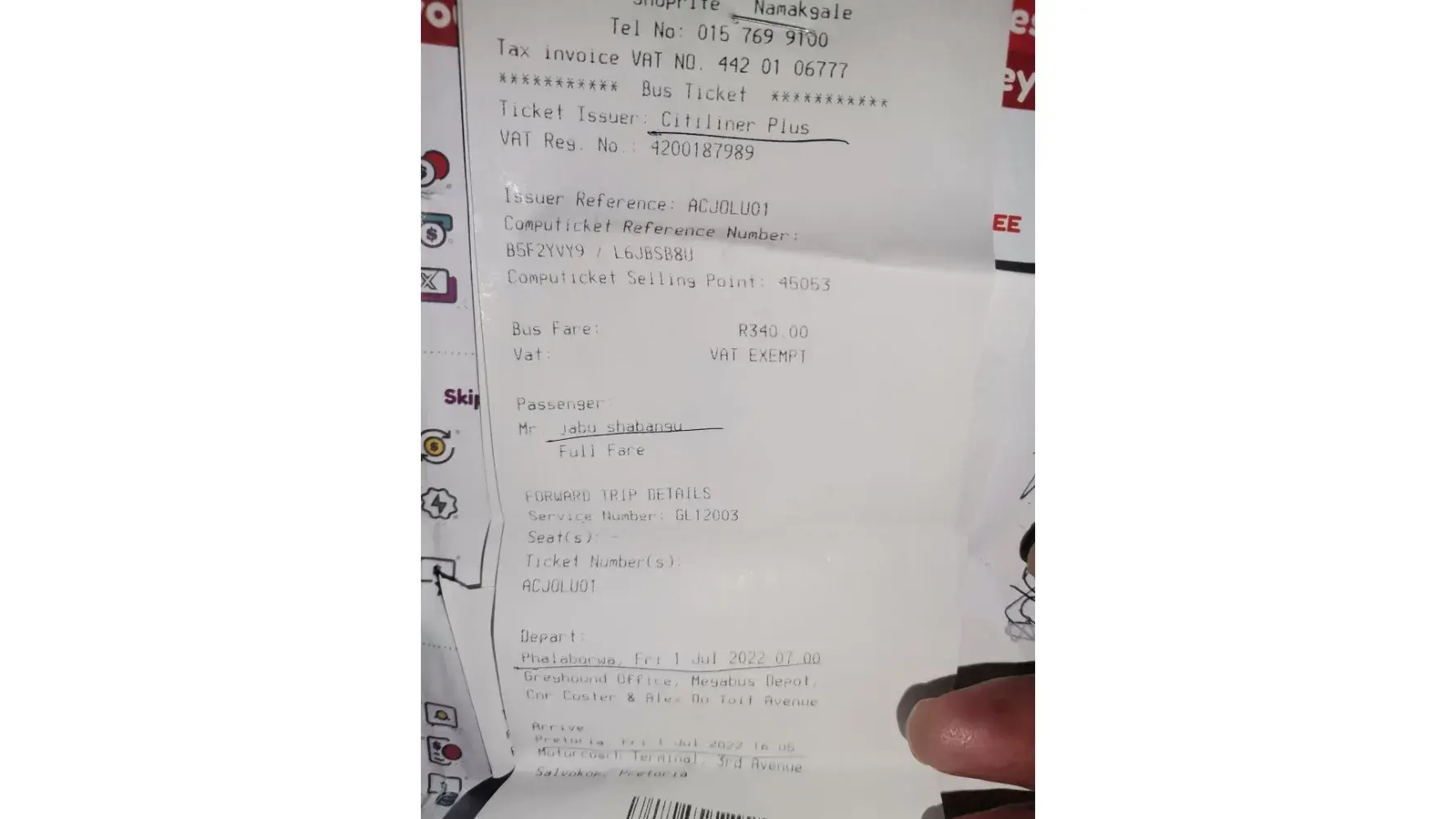 Please assist me urgently...I arrived in Johannesburg with the CitiLiner bus on Monday ,very late with Vusi as the driver from Durban...Vusi was handing out the suitcases without asking for the stubs he had given to the passengers in the morning...We were at the Durban beachfront at around 5.30a.m to depart at 6.00a.m...The bus arrived at 7.00a.m.