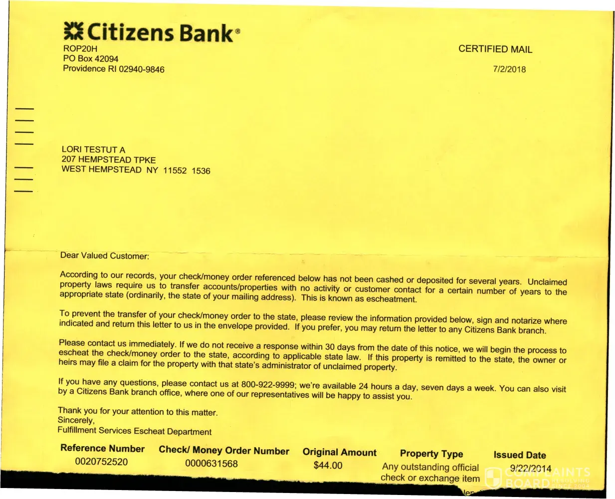 I received a letter from Citizens Bank on 7/2/2018. The letter states that according to their records there is $44.00 due me, Lori Testut.