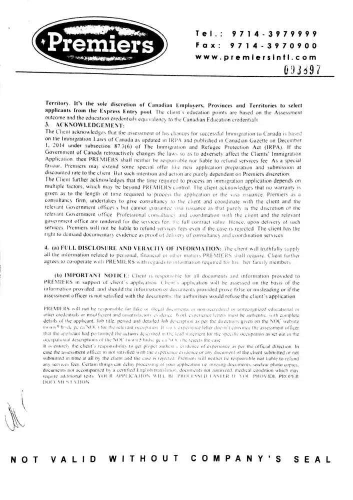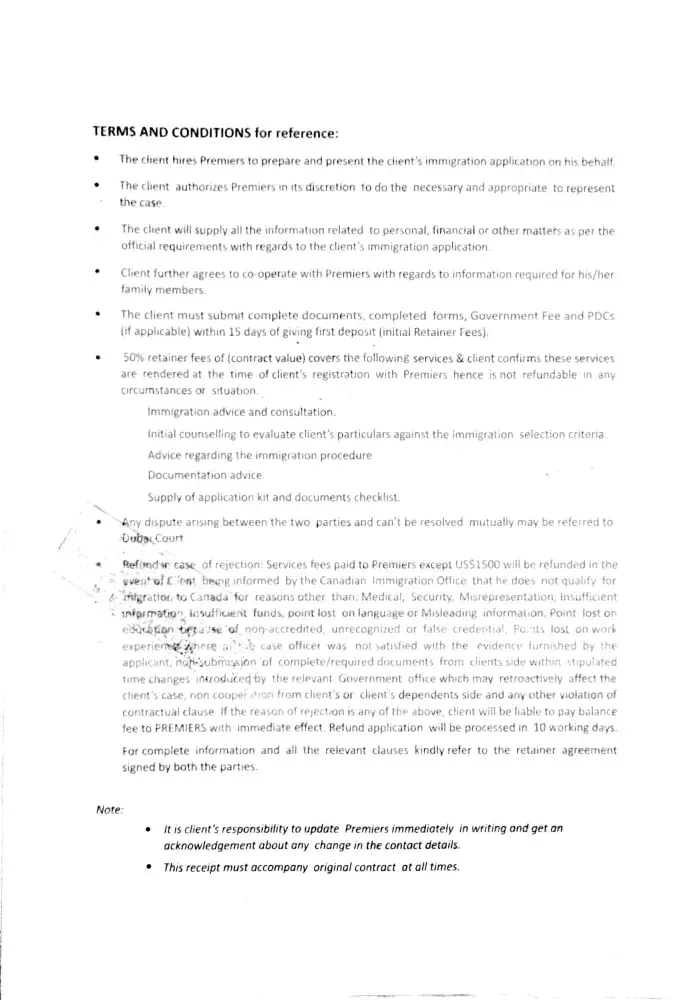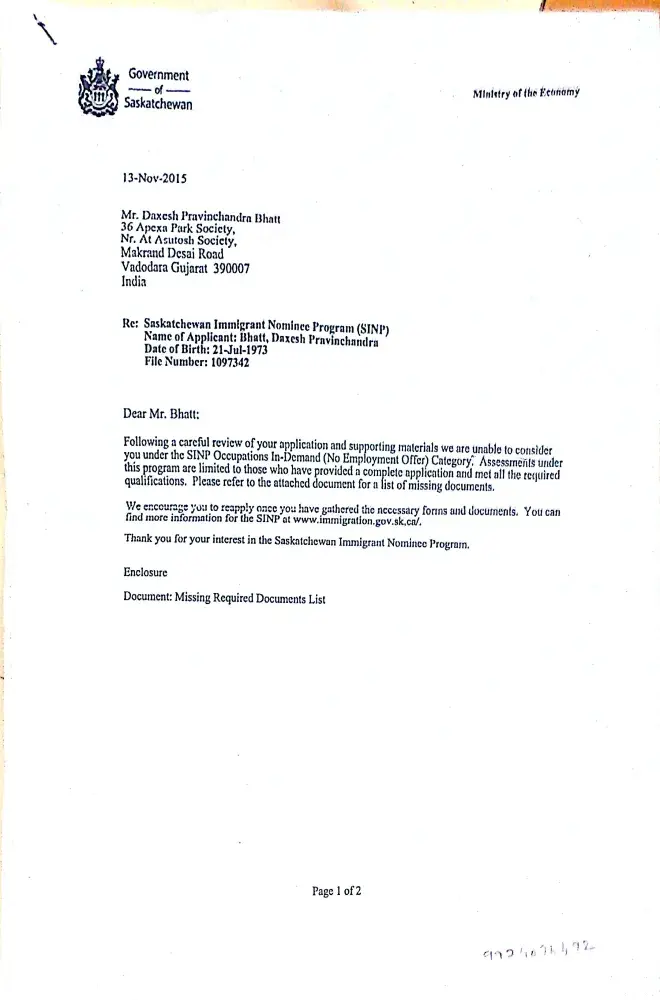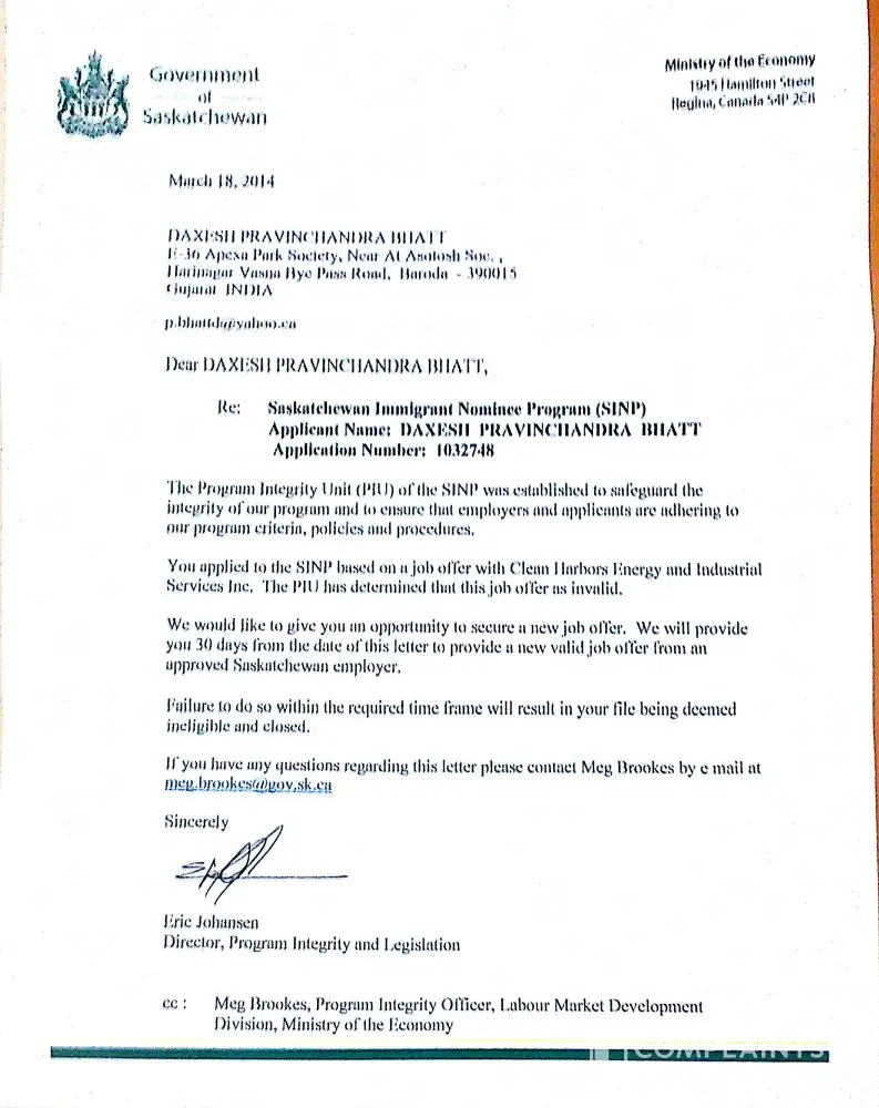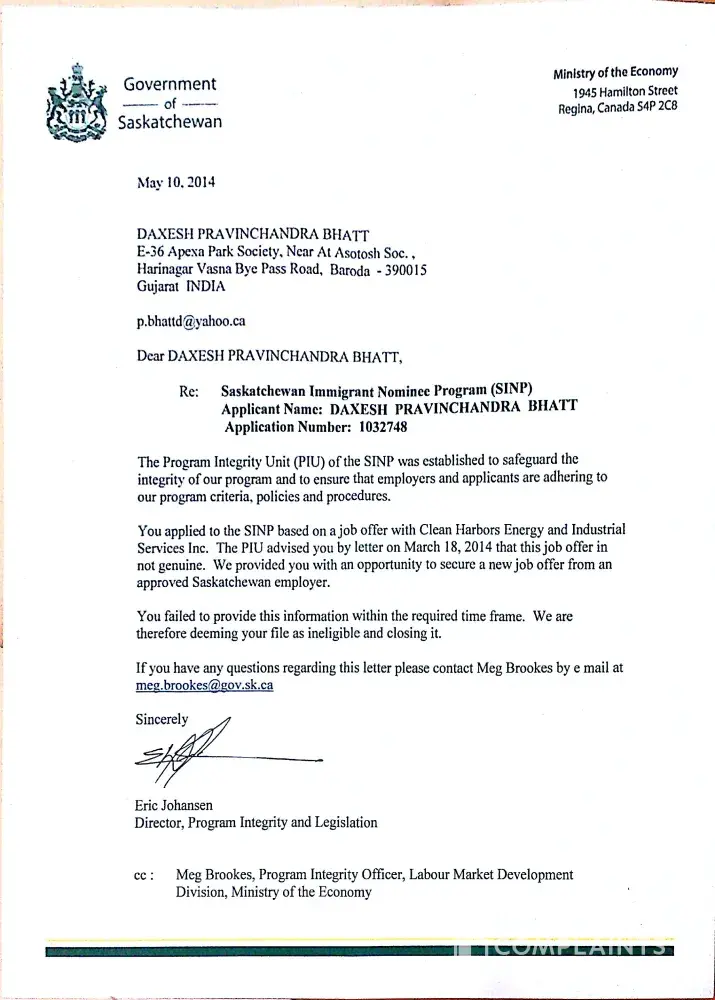 respected sir, i approach mrs. neha. patel of marconis institute private limited in late 2011, they put my application in sansketchwan nominee programme- s.i.n.p., i paid 4, 39, 000 rs fees as per their terms of legal agreement made with me, after two years there was a rejection due to job offer they issued to me, after it they put my another application...