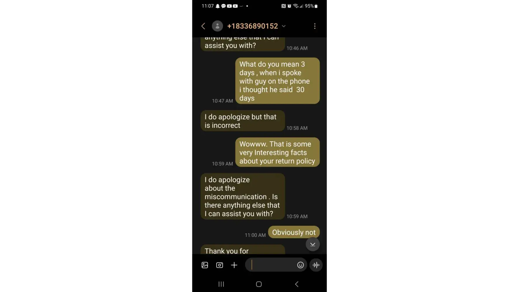 So I reached out through the text message for help and and was told by the lovely representative that their returned policy was only 3 days and when I explained to her that when I spoke with the gentleman after the setup, he said 30 days ans she responded "I do apologize about the miscommunication. Is there anything else that I can assist you with?".
