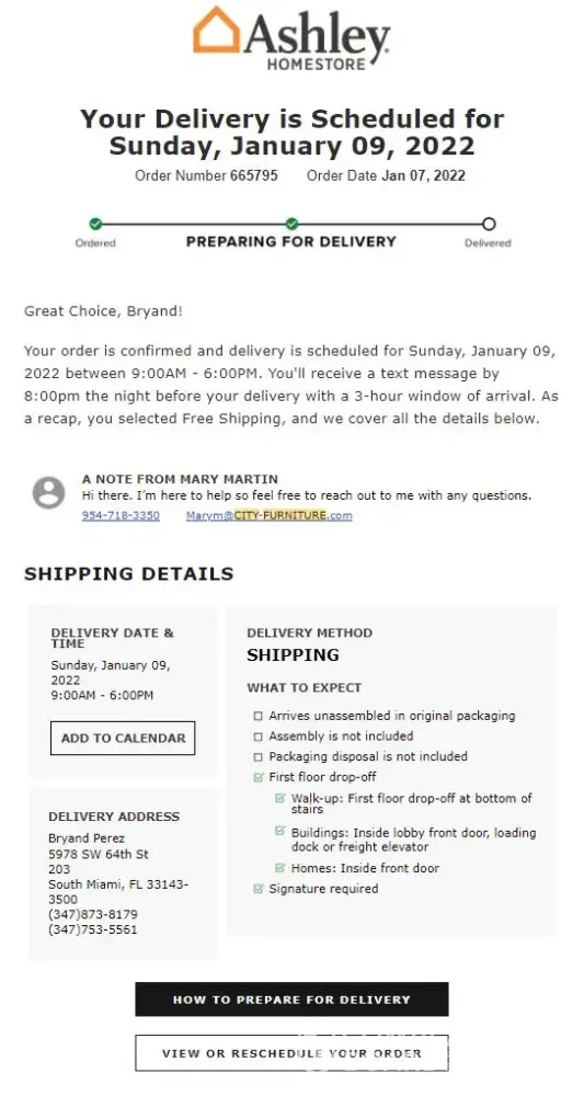 My furniture is delayed and they had an offer for free shipping and assembly and I asked him if he could honor that.