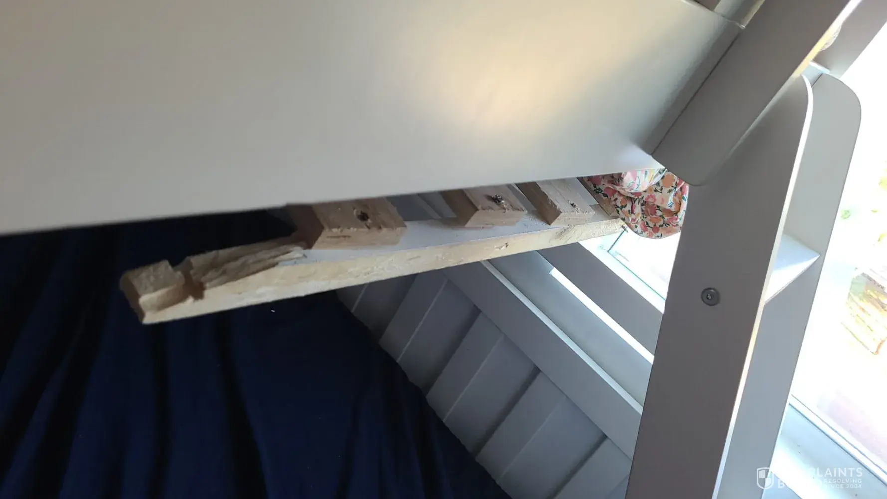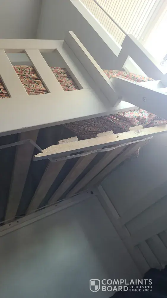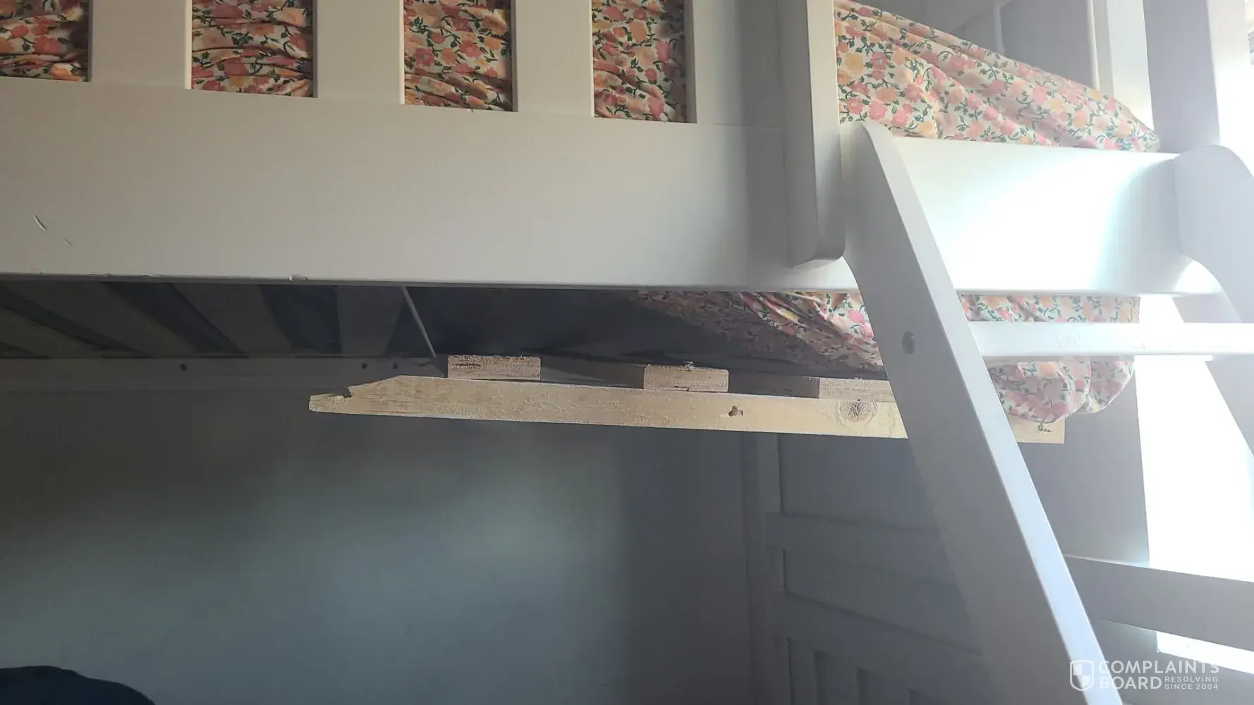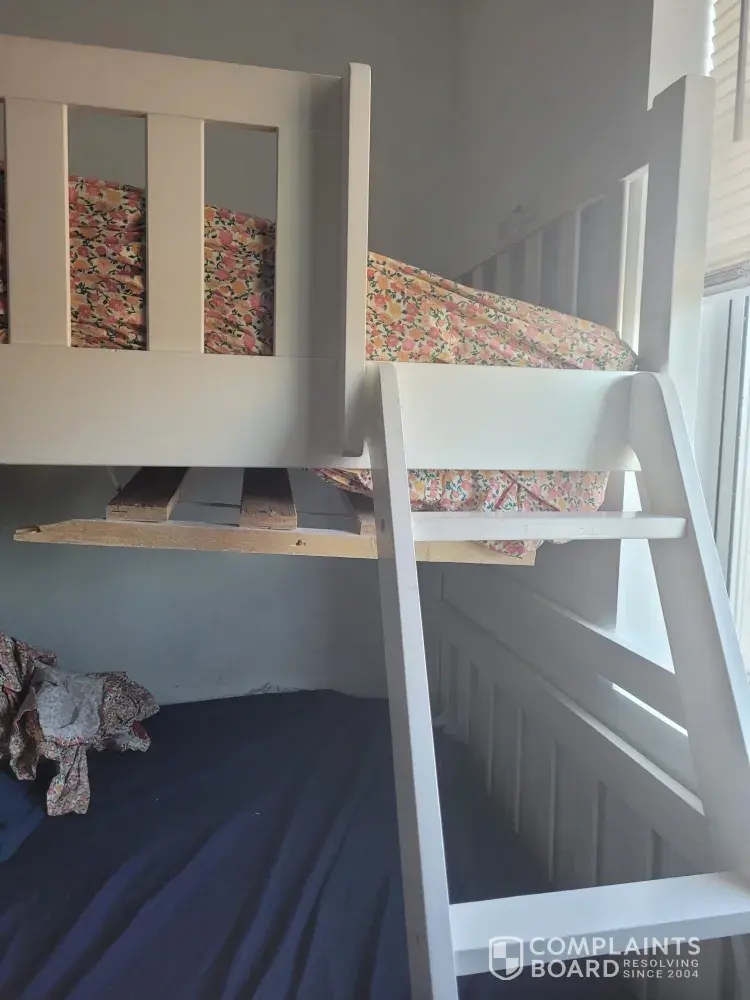 I bought a bunk bed on 8/19 which broke a week ago (order number 795792, roughly $690 tax included, plus $97.80 for warranty); as you can see in the pictures attached, the way the bunk bed broke will make it impossible to use as the top bunk is unavailable and it could fall on the bottom bed at any time (due to the structural damage).