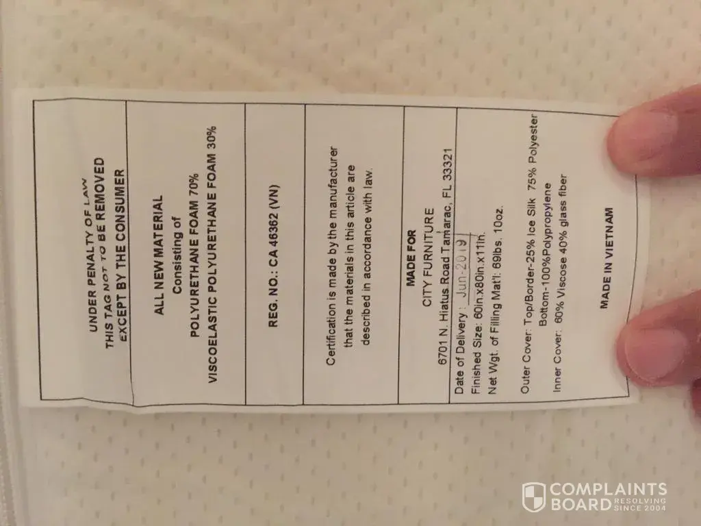 I bought a mattress from city furniture in 2014. it's only been 4 years and my mattress is completely sagging in the middle. i called city furniture to inquire about the factory warranty and every time i talk to one of the customer representatives, inlcluding their manager, they explain that i need a specific serial number listed on the tag of the mattress and without it, my mattress doesn't have warranty. the only tags that the mattress has are the ones that city furniture stapled to the mattress. even my box springs have the same city furniture tags. my mattress and the box springs have the original tags and i even have the city furniture receipt. they have all my information in their system but cannot provide the factory warranty for the mattress. i do not understand how my mattress does not have its factory warranty when i paid $1, 200.00. city furniture is the worst! after my experience with them and seeing that all the tags on the mattress and box spring are from them, i have a feeling i purchased a used mattress and not a new one.