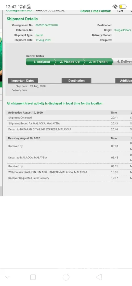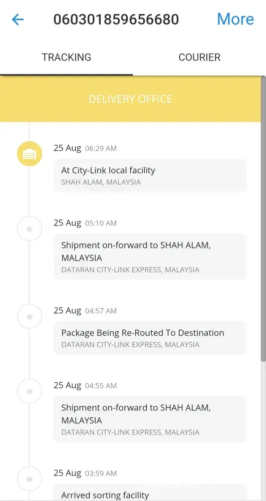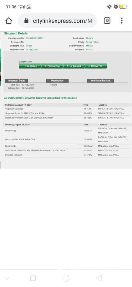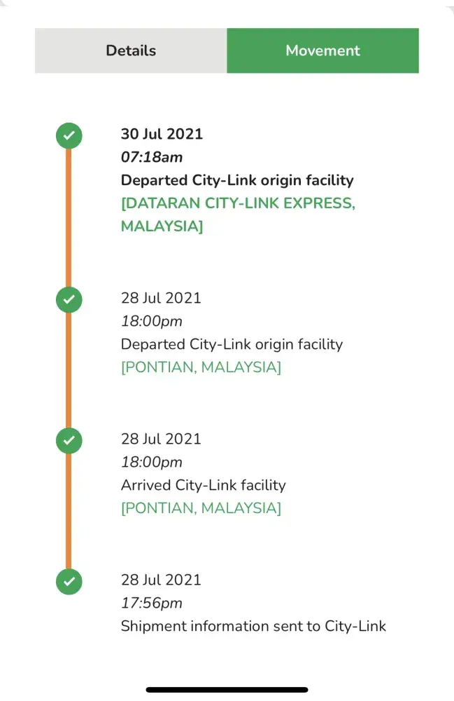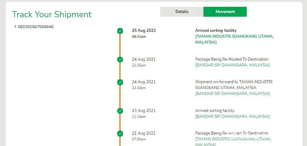 Due to the 2nd shipment had delivered but the 1st shipment sill in "Transit", I had make the complain on JULY 9TH 2021, the answer is those earlier affected shipment was delay and hold in KL warehouse, it will ship soon.