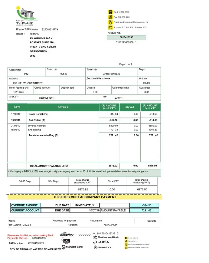 I have sent this information to various people at Tshwane, and also explained this numerous times to the company appointed to recoup the "outstanding" amount. 1. I owned the property located at 728 Nieuwhout Street (Stand 546, unit S0001) up to 2014. Please see an old account for your information attached “1-Old statement.jpgâ€, with my account number...
