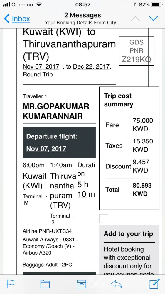 I was planning to go vacation from kuwait to Trivandrum. I took ticket on 09-Oct-2017 through CityBookers .The date I am flying on 07-Nov-2017 to 22-Dec-2017. But on 10th I received a message from KAC it saying “ Dear passenger to avoid cancellation of your booking UXTC34.Flight from TVM to KWT and KWT to TVM please purchase your ticket before 06:35 on 11-Oct-2017†. So what is it means, do I have to pay again ? is it going to cancel tomorrow? What I should do?