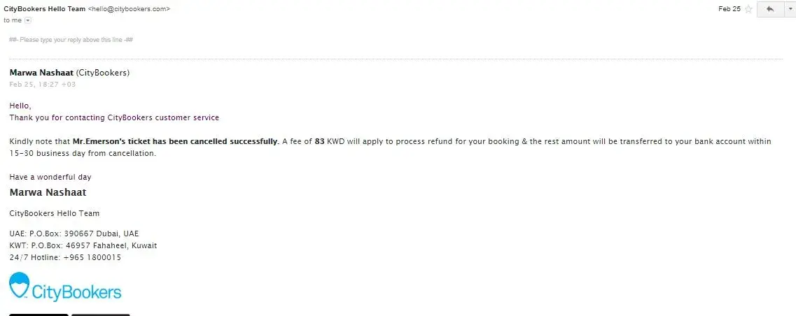 Until now I didnt receive any update regarding the cancellation or the refund progress. I need to receive the refund back since the ticket has been cancelled by city bookers.