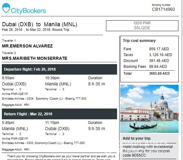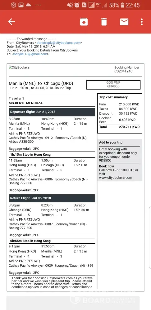 I have bought an airline ticket through City Bookers website on 19th May, a return flight ticket from Manila to Chicago O'Hare dated 21st June to July 5th 2018 under name of Beryl mendoza.