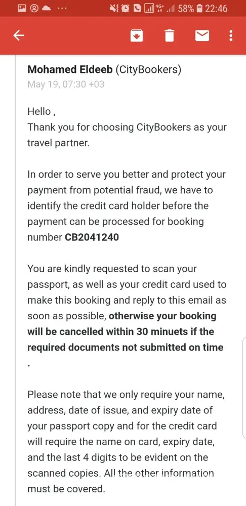 However, after I made the purchase, Ive been asking to provide copy of passport scan details with credit card scan details within 30minutes or else my booking will be cancelled.