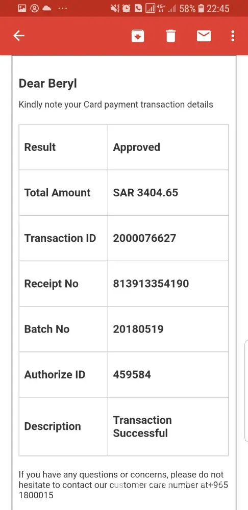 The payment has been made and deducted from Visa card with total amount SAR 3404.65. The transaction ID is [protected].