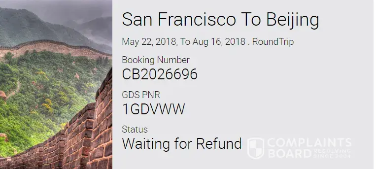 on May 07, 2018 I made a booking from sanfrancisco to beijing through city bookers, reservation no. CB2026696 but