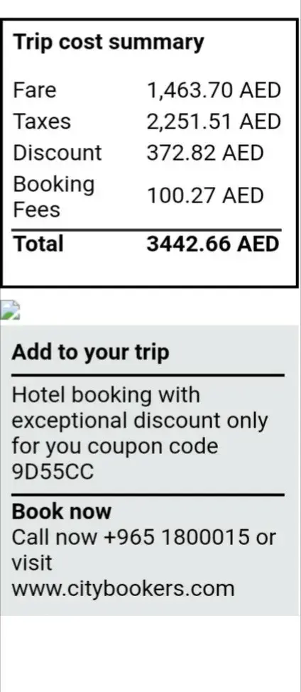 I booked my ticket a few days ago with citybookers, the priced showed up in the website was 3342.39 AED (screen shot attached), then i recived a receipt from city bookers of 3442.66 AED( see below), and finally i was charged 3535.23 AED (Attached) . Wich is around 198 AED extra from the amount i decided to book for.