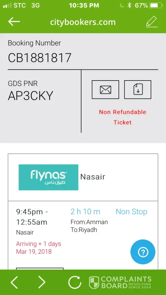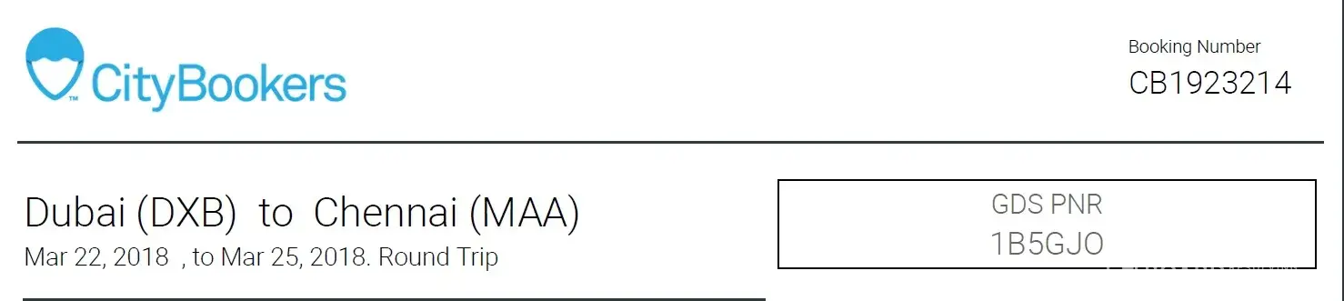 I booked a ticket on citybookers.com (CB1923214) on 21 march 2018 for my travel on 22-Mar-17, from Dubai to Chennai. I got the payment confirmation and reservation with PNR number-1B5GJO for the travel schedule.