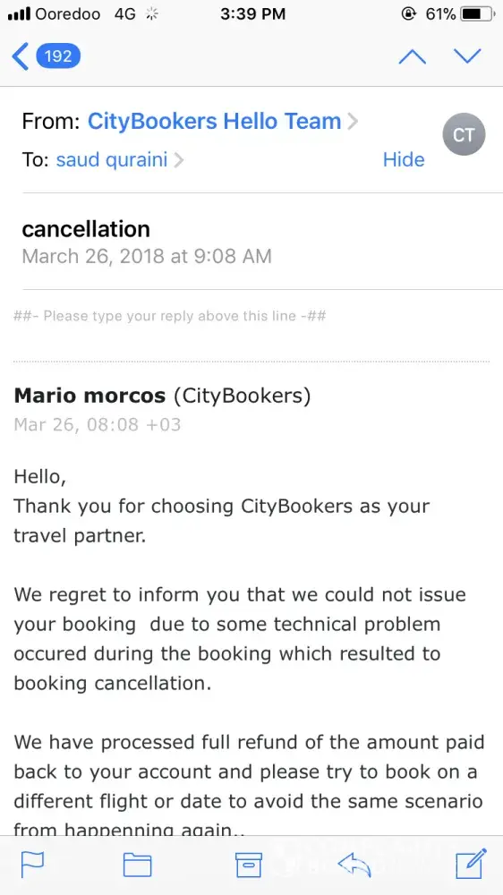 I made a ticket booking via Citybookers on 15 Jan2018, and I have recived a cancellation email due to some technical issue from the airline company.