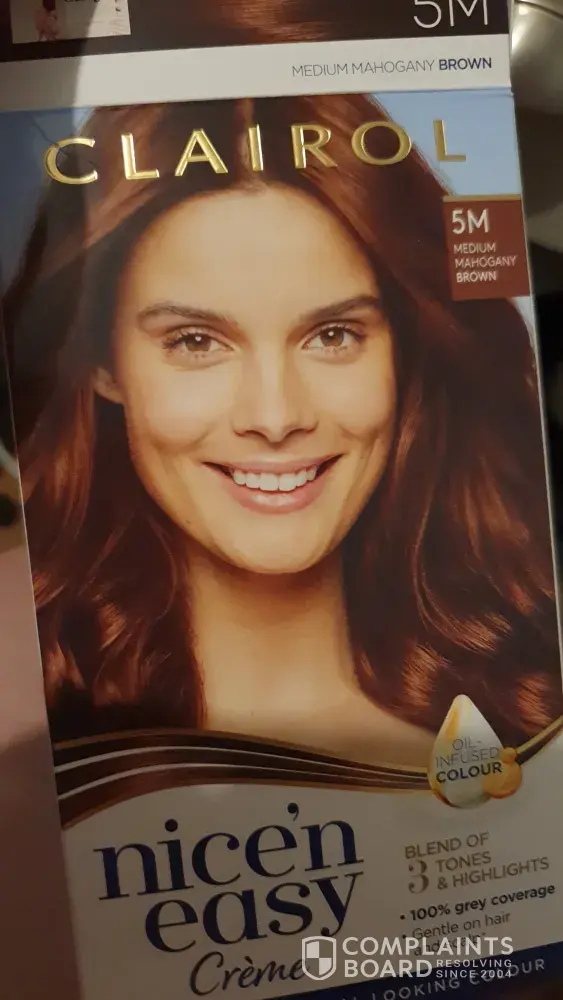 Desired outcome: I would like to know how this packaging error occurred and how it made it to the shelves of Woolworths in Plumpton to be sold to unknowing customers. I demand a replacement product with the Clairol Nice'n Easy box dye in 2 Black.