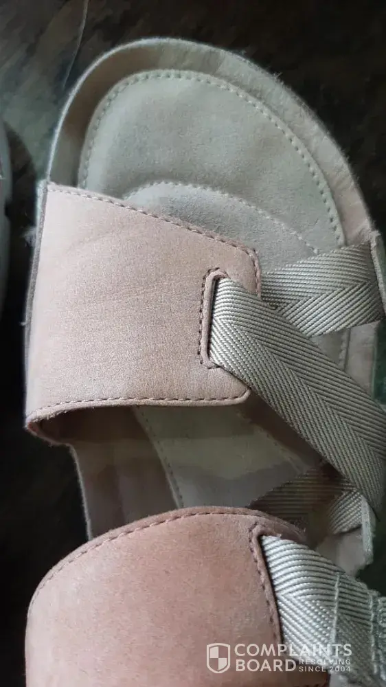 As you can see from the attached pictures, my sandals are new. I have worn them less that 2 months and never on rain. However, they are now useless.