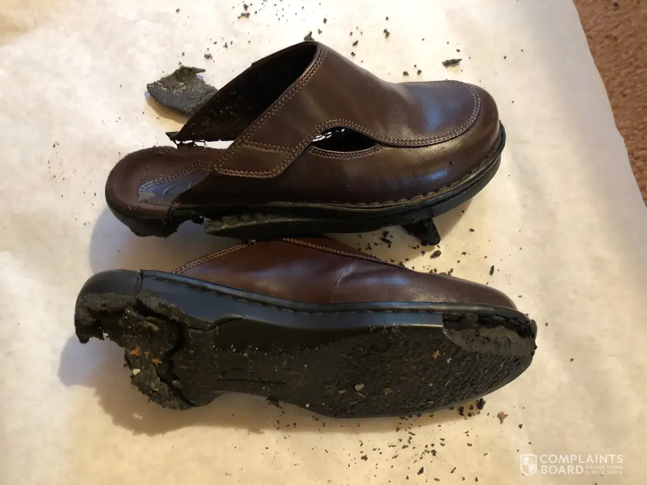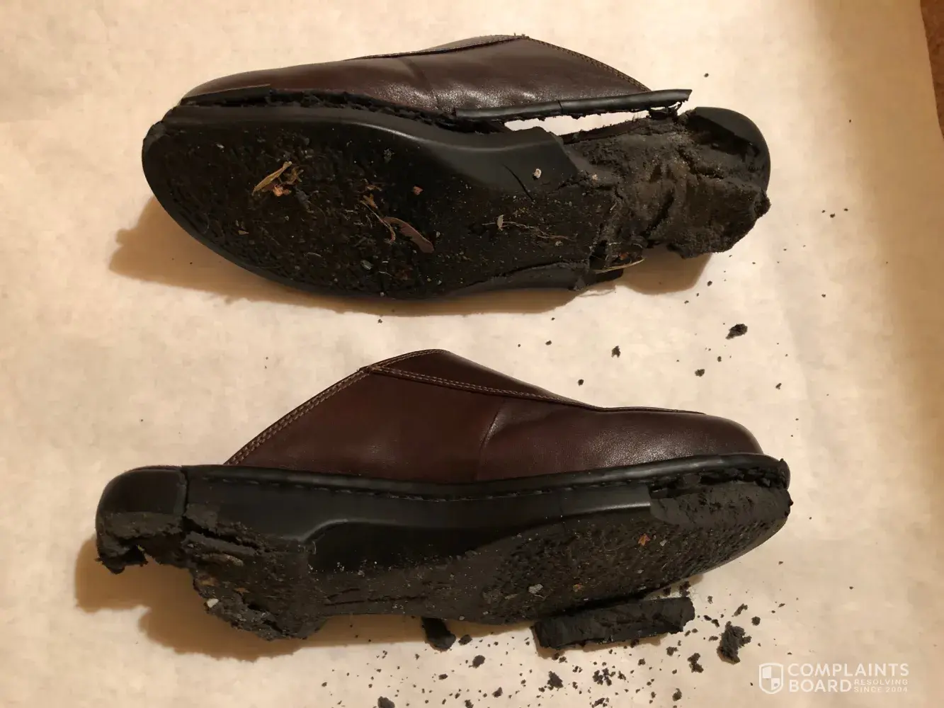 I am a handicapped 36 year old woman. I put on my Clark's Artisan shoes this morning to drive to work. I noticed my shoes did not feel right but thought it might be my weight gain. When I got out of the car I noticed a large chunk of black "dirt" by the brake which turned out to be from my shoes. When I looked down at my soles and I found out that my shoes were torn up and full of holes and large crevasses. I could have fallen very easily and shudder to think of injuries!