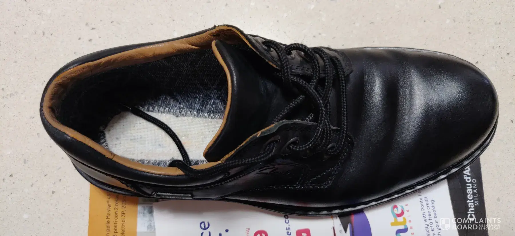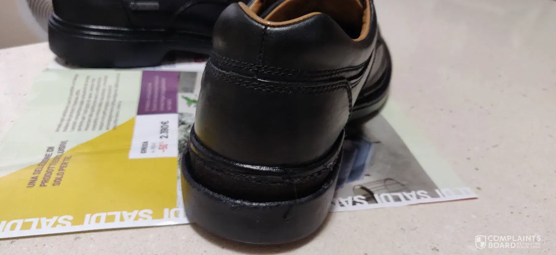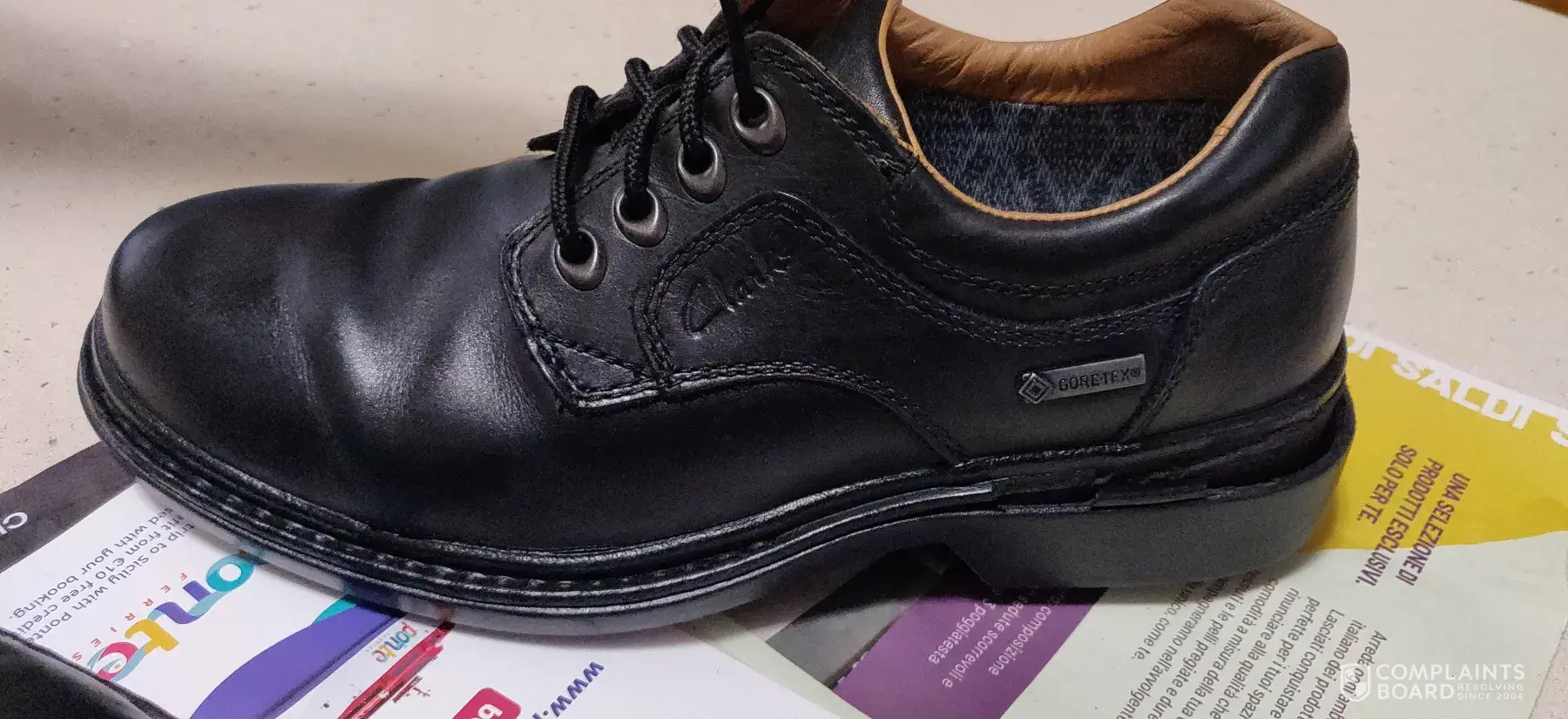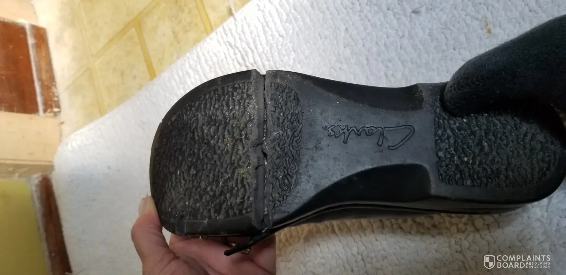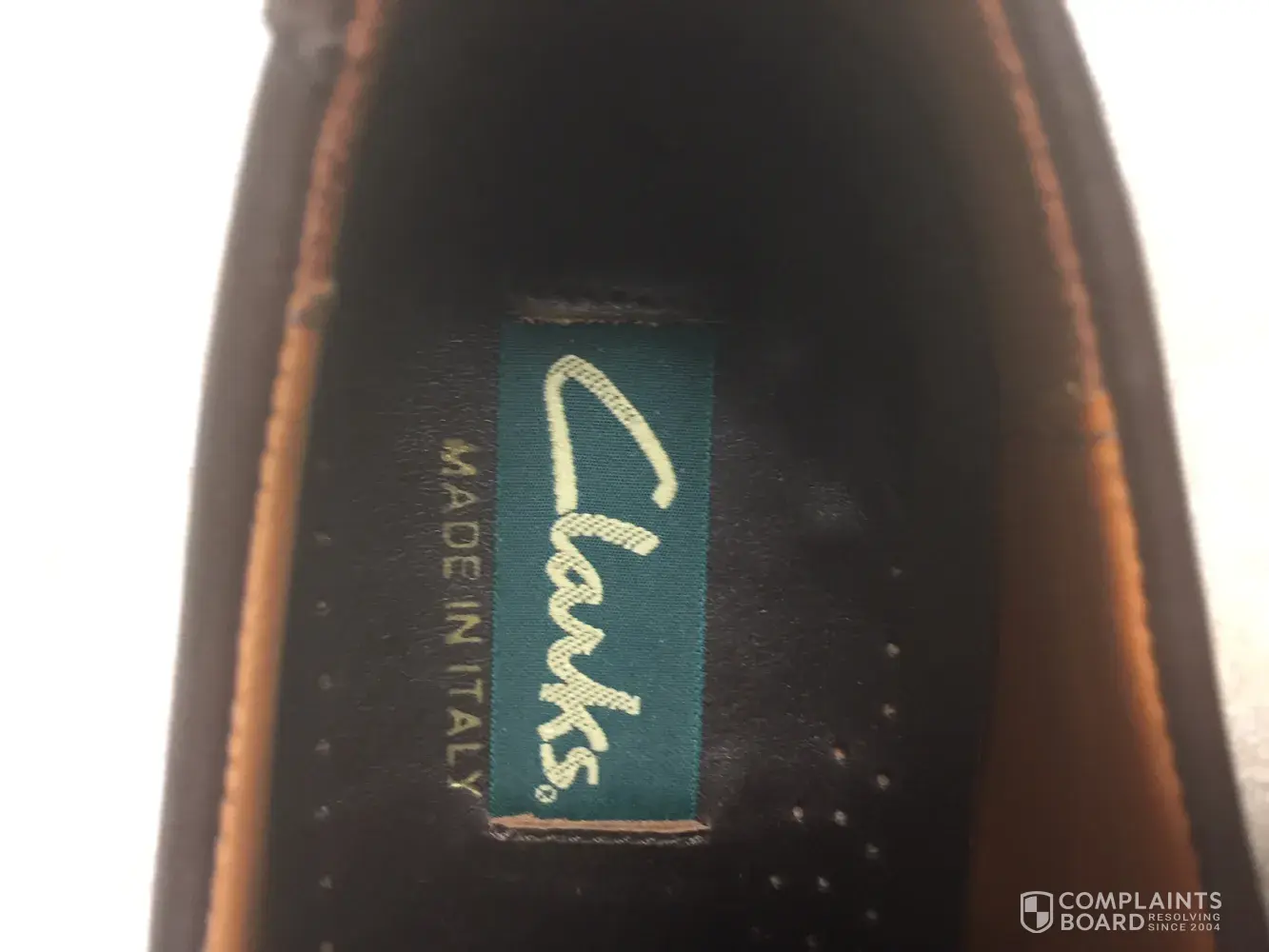 I bought a pair of Clarks shoes.They were brand new and looked perfect.I put my right foot in the right shoe.Then I turned to watch the tv for about 5 minutes. Then I went to put on the left and saw the shoe on my right foot had completely fallen apart.I couldn't believe it, bits of rubber on the floor, uppers split open, sole broken into cracked pieces and also, a lot of dust and debris was inside the shoe and it looked like there were areas of wear inside the toe section.