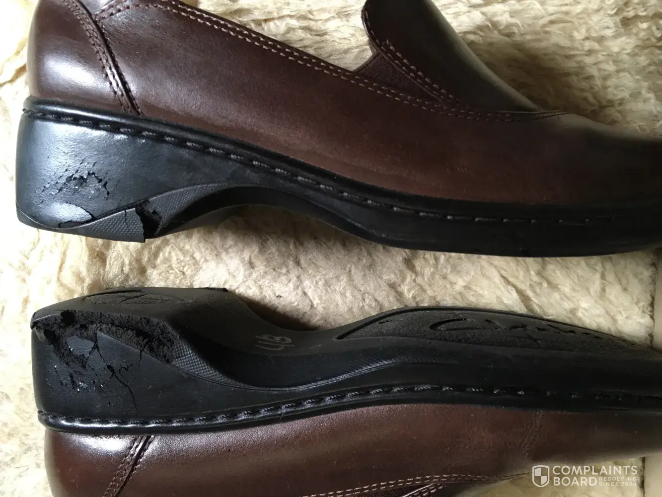 I see about the same complaint that I have. Wore my shoes Saturday shopping, they have not been worn that much, I have seven other pair of Clark's besides other shoes. I am retired, just wear them to church and shopping. Well, the rubber on the right heel completely came apart disintergrated spontaneougly on both, leather pulled apart, the same on the left. I tried to send a e-mail, no response, tried calling, put on hold three different times for 30 minutes, who has the time to stand around waiting. I will not buy another pair of Clark's, so disappointed, was so angry, with my shoes falling apart while shopping, nearly barefoot. I went to the store where I had bought them they said that wasn't the first ones, to contact Clark's company. Well no such luck.