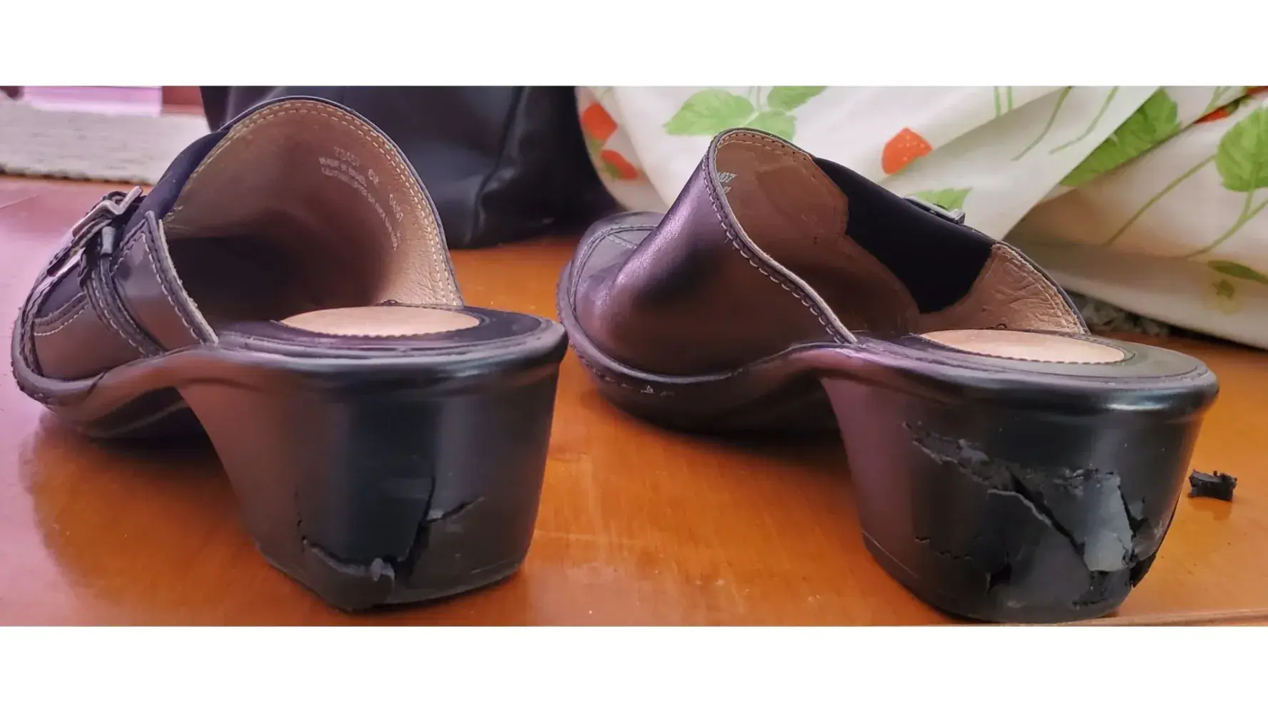 Same problem here... I have a pair of Clark mules, with about a 2 inch heel. Hardly ever worn them, and had them stored in a plastic sweater container under my bed. The leather is pristine, and the soles showed very little signs of wear. Pulled them out, just the other day, to run errands. First stop was to get my bloodwork done. As I was walking out of LabCorp, my footing felt strange on my left foot. I was too embarrassed to stop, as I walked out of the lobby, to inspect what was going on. I basically hobbled out to my car. As I returned to my car, and looked down at the shoe, I saw the whole heel had crumbled apart. All that was left was the hint of some sort of spring mechanism for heel support. I thought "WTH!"... Returned home because I surely wasn't getting anything else done with those shoes. Shameful too, because they are the cutest pair of shoes.