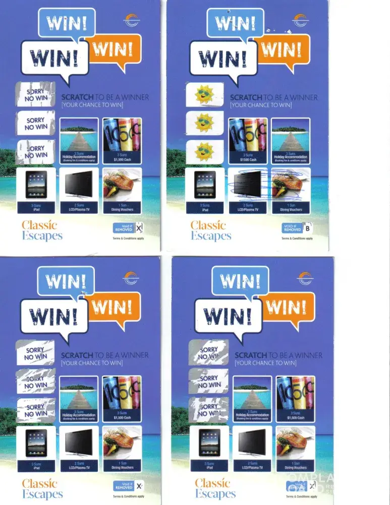 Classic Escape Holidays - beware of what they offer you and how they offer it to you. My wife and I were approached by Classic Escapes Promoters in a major shopping center in Sydney in Jan 2013. We were handed 4 scratch cards to win a prize. We scratched the 4 cards and one of those cards was a winner. We had won either a holiday, an ipad or $1500.00 cash...
