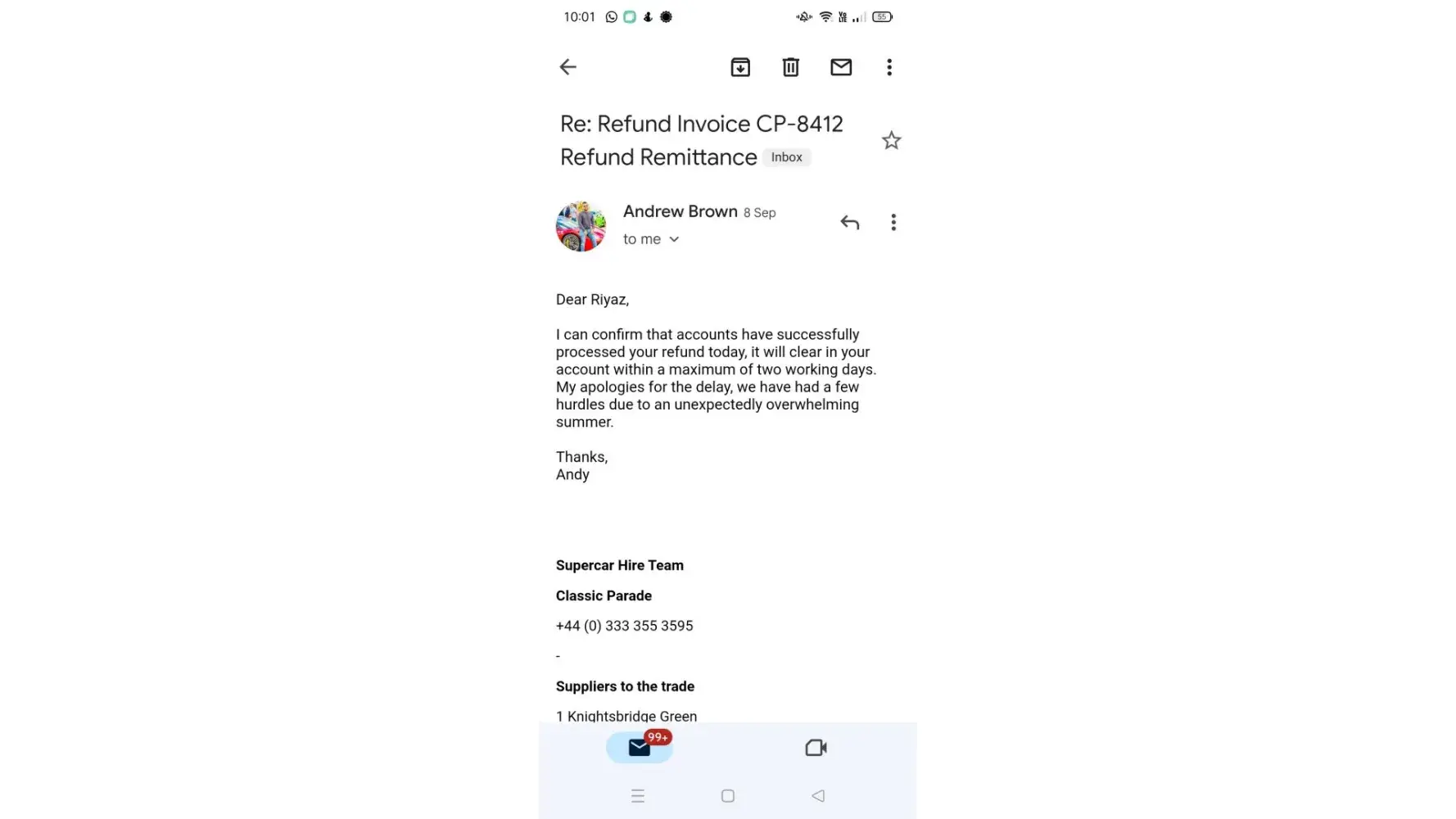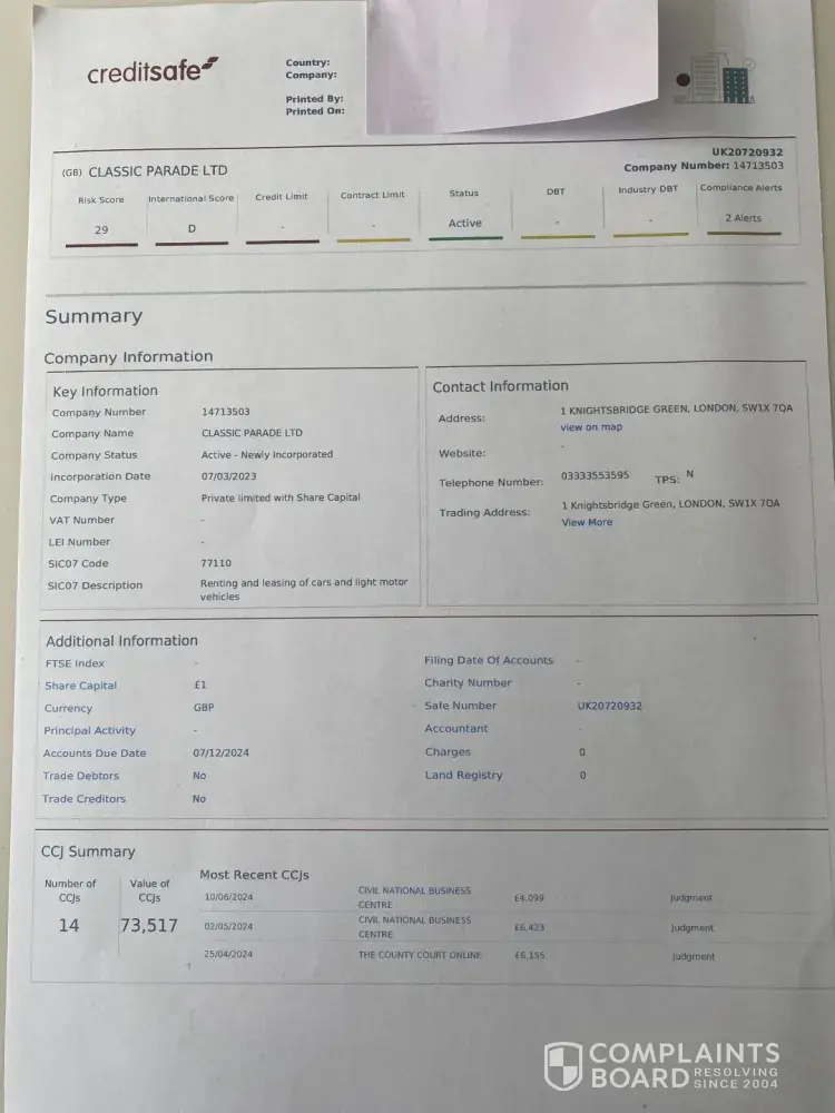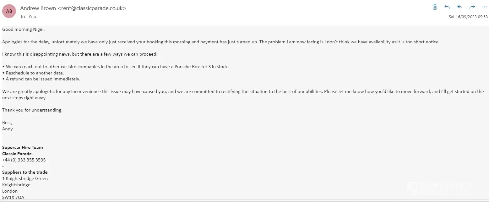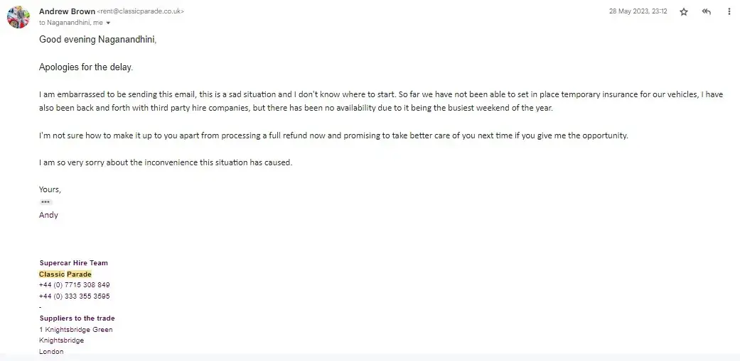 Had hired a Nissan GTR for a Saturday starting at 12:00am. Waited till 03:00 and after about 10 calls with the number +[protected] (which is absolutely useless) where they said we'll call you back (never did) or we'll escalate it I gave up and went to bed. I woke up to no messages or calls at all. The one email the company has, [protected]@classicparade.co.uk, which belongs to an Andrew Brown seems to be the only way of contacting or communicating with this company as the customer service team on that number don't seem to have a clue on anything that is going on - all they asked for was my name but didn't seem to have any tracking or useful information on car delivery. Anyway, Mr 'Brown' finally responds at around 12pm the next day and says sorry but the engine management light came on last night - which is odd as I've seen a few reviews that have said the same thing happened to them but there's no pictures or evidence and they were happy to keep me waiting for 3 hours. Make of that what you will but I didn't care at that point and just wanted a refund which is what Andrew said would be done first thing Monday morning and he would compensate me by offering me a free day of car hire in the future - how exciting! Shocker but it wasn't done on Monday morning and it's now Thursday at the time of this complaint. I held off on writing this complaint but enough is enough I want my £2450 back - Andrew was very responsive when it came to paying the invoice and booking the car but now it's time to pay me back he's suddenly quiet. There's a lot of red flags about this company and it is not well run with a great lack of professionalism that I wish I'd seen before using this company (e.g. company address of 1 Knightsbridge Grn, London SW1X 7QA but not registered on companies house, one email with no indication of any teams, 100s of bot reviews with only one review, negative reviews all reporting similar things, no internet footprint of this Andrew Brown character etc.)