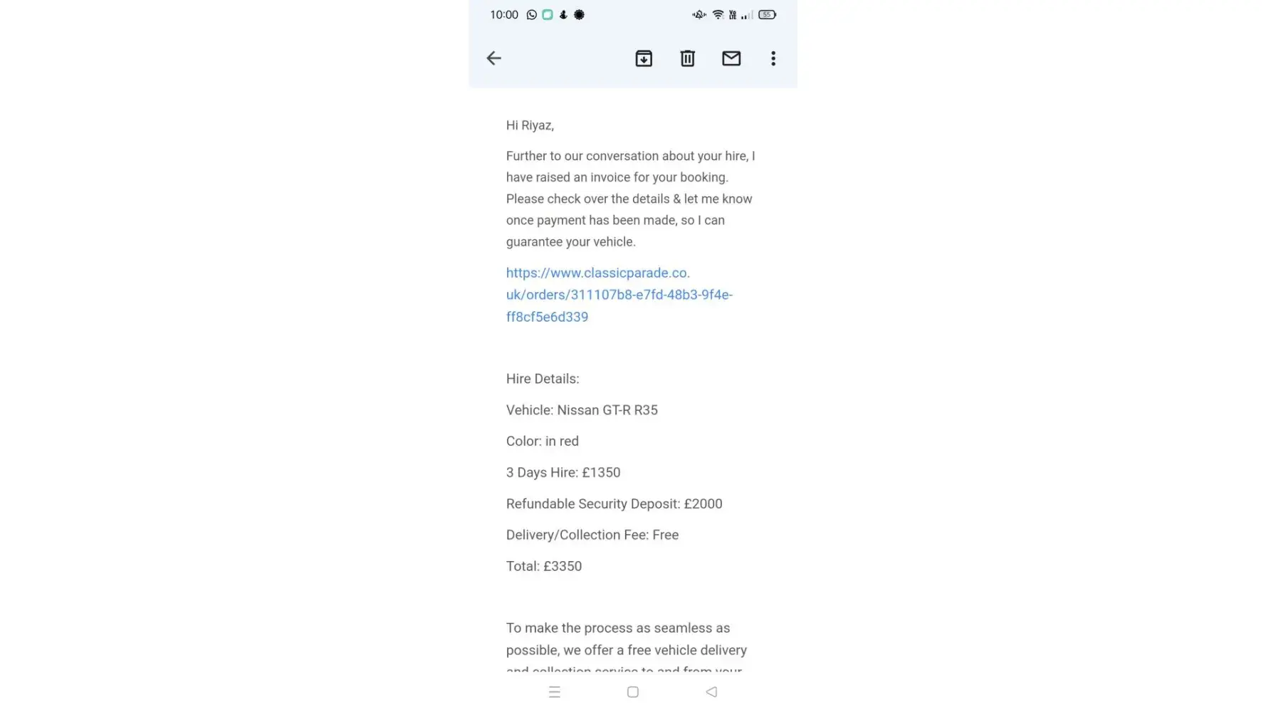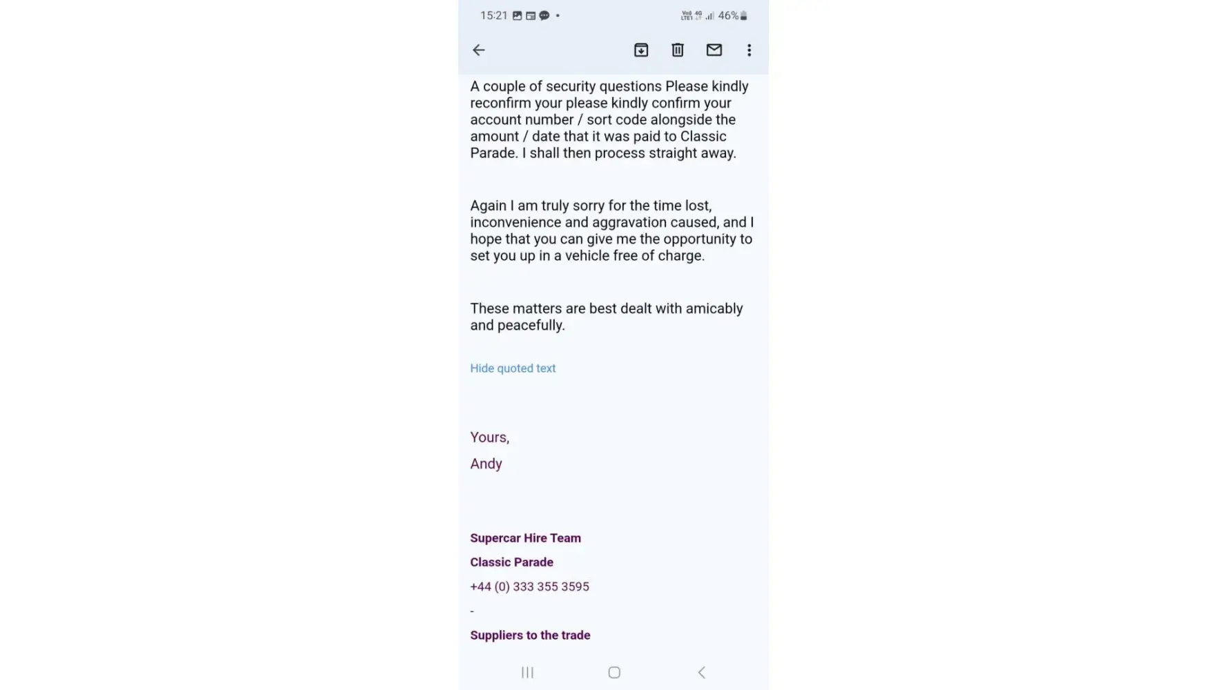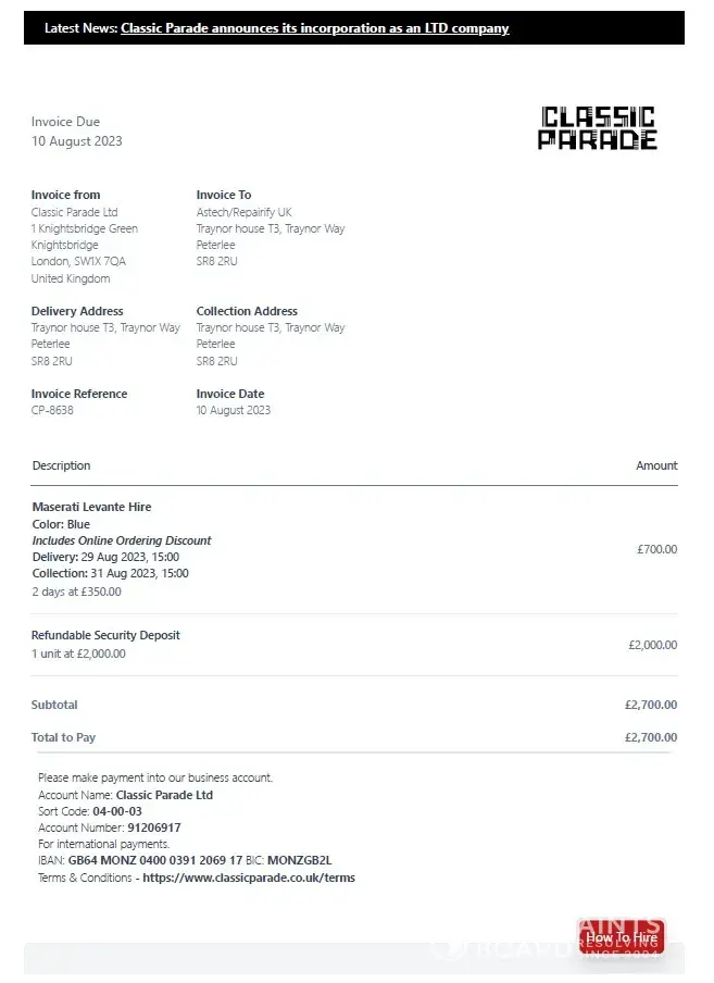 I have requested a Maserati Levante for 2 days from Classic Parade on the 8 of August. I received a quote from Andrew Brown, and transferred them the 2 day hire fee (£700) plus the deposit of £2000. Andrew responded promptly and let me know checks were all good for the delivery.