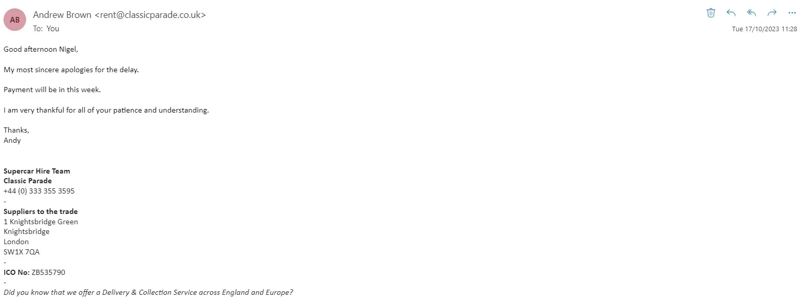 I requested a Ferrari F430 for 2 days from Classic Parade on the 7th August. I received a quote right away from Andrew Brown, and transferred the 2 day hire fee (£1.5k) plus the deposit of £5k. Andy responded promptly and let me know checks were all good for the delivery.