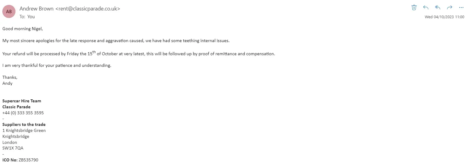 I hired a Lamborghini Huracan Spyder for the 20th August 2023. I gave a £5000 deposit and it was £1100 for the day to hire the supercar. A day or two before the hire day I received an email from Mr Andrew Brown about the Lamborghini having the engine light on and they would be unable to provide the car for the day I needed. There was an attempt to find a third party solution so the car could still be delivered for the day I needed. Unfortunately Classic Parade could not deliver the car even in this way. I was not too gutted about the car not turning up. After all it would just be a case of refunding my money so I can move on. Mr Brown said he could promptly give a refund. It is now the 9th of October 2023 and he has replied by email many times that he has refunded the money. However I have not received anything yet on numerous occasions.