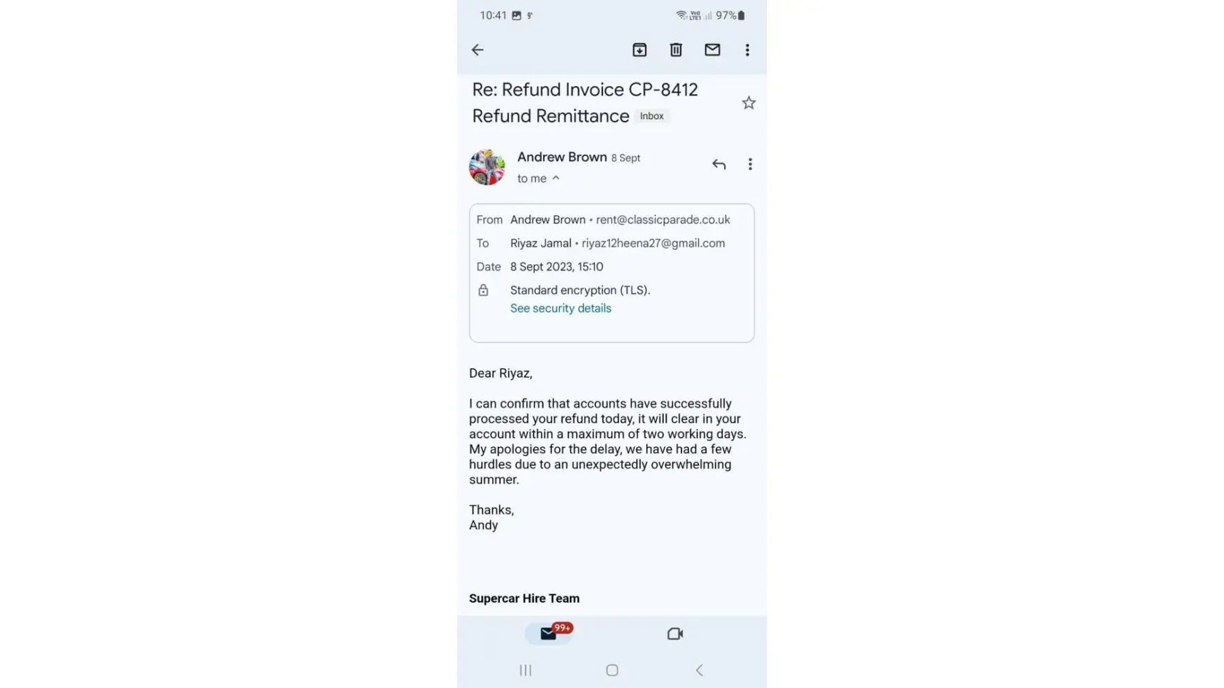 We wanted to hire a supercar for our client and we had a contact with Andrew Brown of this company who quoted 5600 pounds for the deposit and the rental. The rental date was set as 30th May, 2023 and the transfer was made a week before. But, a day before the rental, he called and emailed us mentioning that the rental can't be done the next day as they had a some issue with the insurance provider. So, he offered us an option for a refund. We opted for the refund and sent him the bank account details. From then on and until now, he has stopped responding to our emails and calls and has not refunded the money as well. We have also raised a complaint with the Metropolitan Police, UK regarding the same and we are attaching the complaint (fraud) report for your reference. Please help us in getting our money back. Thanks.