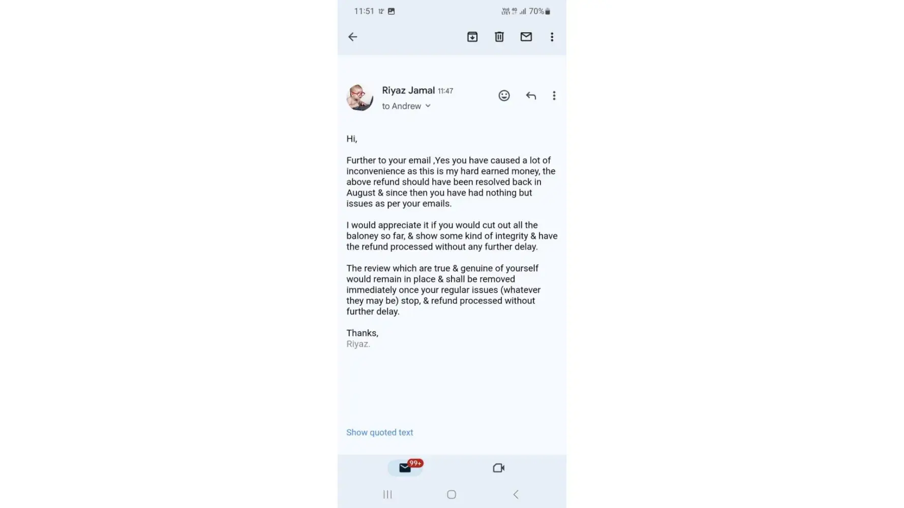 Attached recent email from Andrew Brown(Andy) where contents of the email are relating to nothing but issues since August. Kindly have the integrity and process/resolve the refund without any further delay.