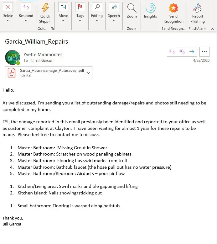 Desired outcome: At minimum the $10,000.00 back for the brand new roof I had to pay for on a BRAND NEW home the very first day