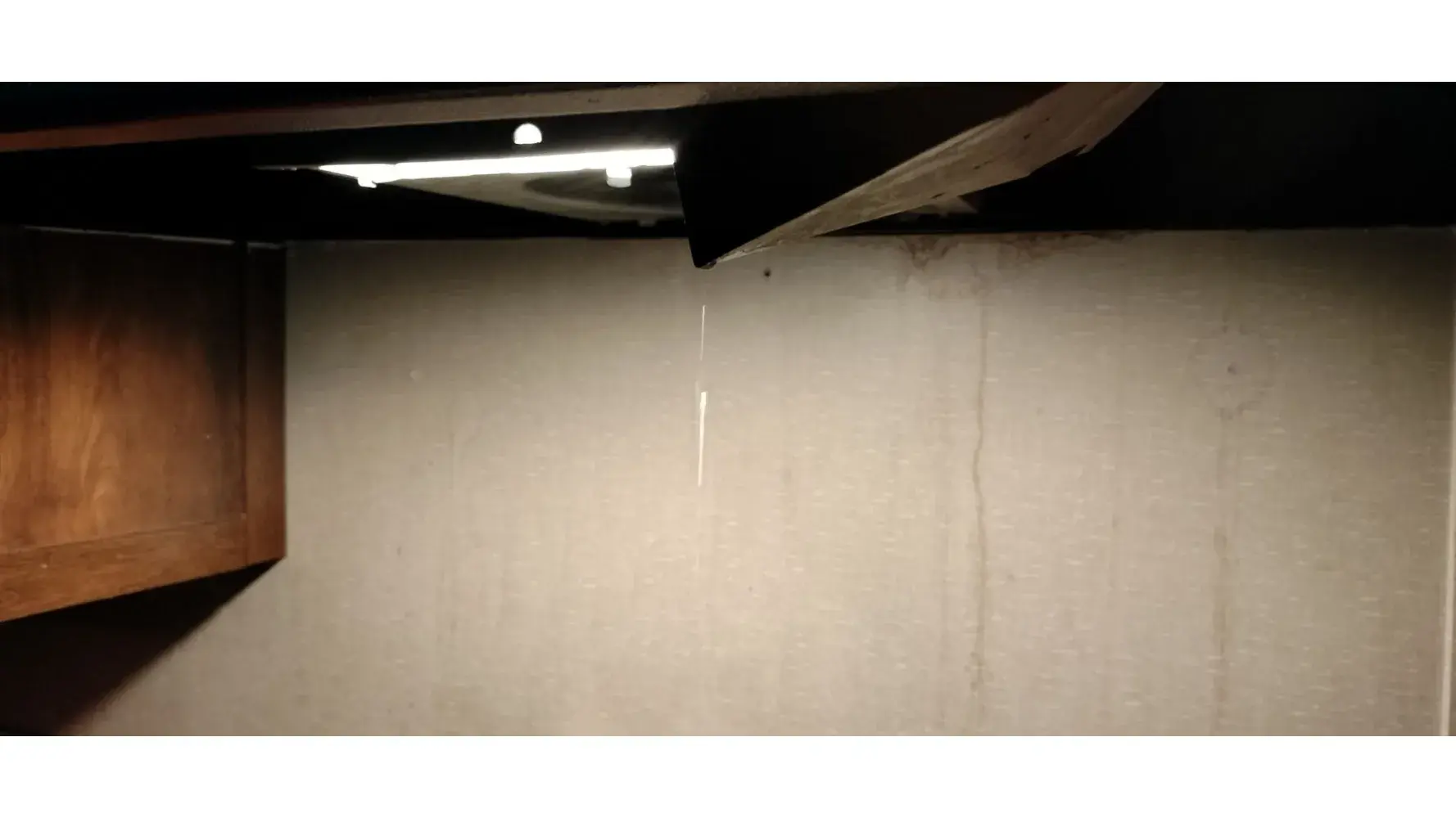 On the back wall has ceiling has brown stains along the edge of the wall in result of leaking water from the roof it appears that it rains and water leaks comes off the edge are the shingles and it's pushes back under the shingles and behind the first 2x4 and drains down onto the ceiling down the walls in one room to the floor of the master bedroom. I've got black mold over one window from heavy water leak also I have a leak it comes out of the center of the oven hood and leaks onto the oven. I've had a leak prior to this file on my insurance and that late has been repaired I haven't had any more problems out yet but now i'm having this problem and I just have noticed it this year