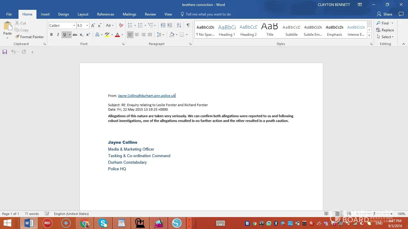 2 see attatcheed email sent from durham constabulary to the journalist marcello mega of the sunday people confirming not only my brothers conviction for sexually attacking a child but my fathers arrest for sexually assaulting me.additionally as my brother is uner investigation by the press at the moment, im sure more will come to light.