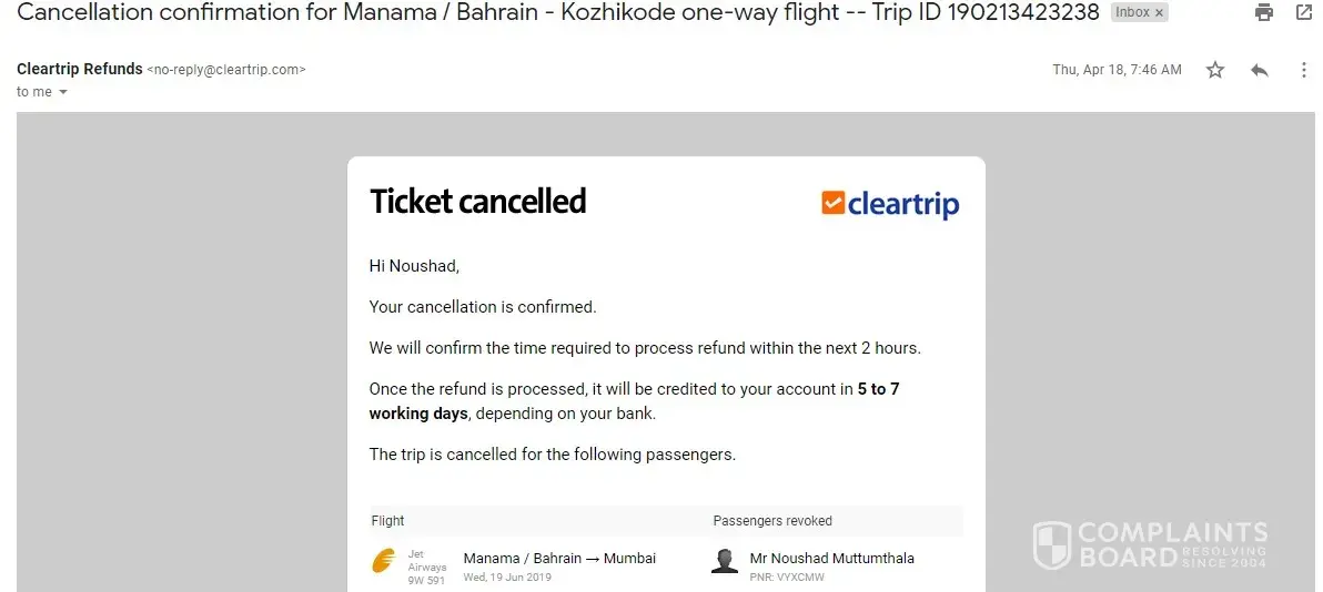 I have booked ticket for myself and family from Bahrain to Kozhikode from cleartrip on 13th Feb 2019 including Travel Guard policy. We got the confirmed Jet Airways ticket for 19th June 2019. Cleartrip cancelled my ticket on 18th April 2019 due to Jet Airways suspended all flights, and cleartrip agent confirmed that I will get my refund within 7 working days. I have been waiting more than 7 months for clear trip to refund my amount. I have contacted many times but I never get a clear answer. I know that Jet Airways stopped the service but I have paid to clear trip so clear trip is responsible to refund the amount. I am trying to chat with customer care team and it seems blocked me as I am unable to go to the chat window, I tried calling and once enter my trip ID no one is answering calls.. I have proof for all these including the message I received form one of your team member said that it will be paid in 7 days. I spoke to some of cleratrip customer service team but no use, they will ask me to wait for more days . I have paid for the insurance as well and there is no benefits.