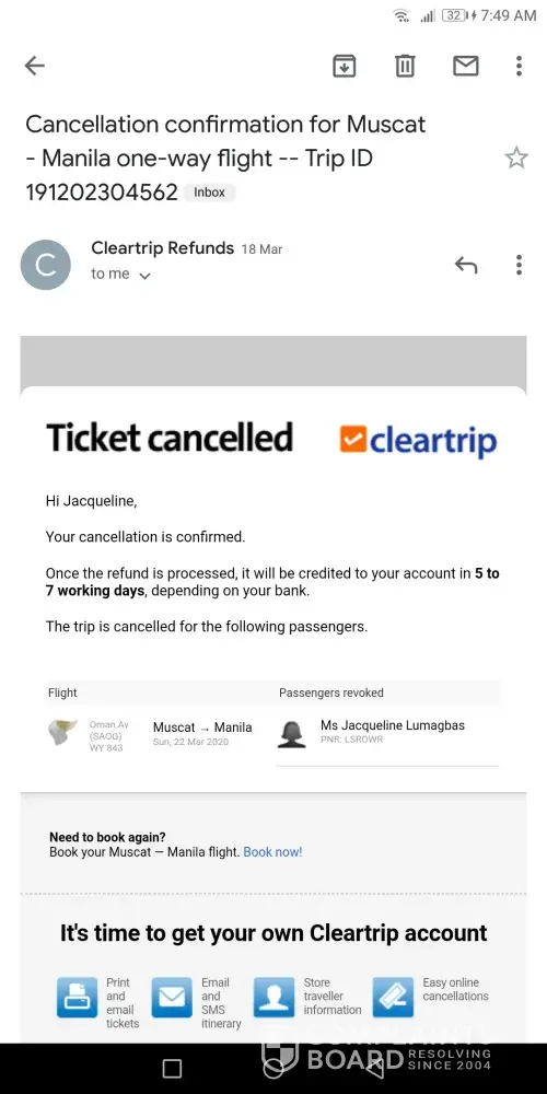 I booked my ticket on cleartrip for my flight back home on march 22, 2020. Unfortunately because of covid the airline (oman air) cancelled all the flights as per the email that they sent my trip was cancelled they even ask me to redirect to the airline. So I called the airline, ask for assistance about this cancelled flight. Oman air assured me that all flights that has been affected will get a full refund. But since in my case I booked it on cleartrip. I need to contact them first so they will be the one who will cancel it and process the full refund. I even called oman air multiple times to confirm that. So I go online march 18th, since cleartrip said that they are getting huge number of calls which I understand. I know I am not the only one who's flight was cancelled. And since they have an option to cancel the ticket online. I cancelled it directly on their website, waited for an email confirmation after 3 hrs (will be attaching screen shots of the confirmation at the end) so base on the email they said that cancellation is confirmed will need to wait 5-7 bus. Days for the refund. After 7 bus days, I contacted them about the refund and now they said that they will process it in the next 60 days because of the huge # of request. I waited another 2 mos for the refund. Now they are saying that I need to wait until june 21st for the confirmation of the cancellation which I clearly cancelled it march 18th. I tried reaching out to them becaise it is taking time. Now they are only sending me generated email. I tried to reach a live person who can help me with these through their email support I got a response qith them that the airline is not giving out refund, which I confirmed from the airline and said that they are giving refund. That person said that they will contact airline and will get back to me, its been 1 week now I don't get a response from them. I also got another representative who clearly don't know what they are doing. This person said that the ticket is not cancelled and they converted it to an ope ticket, and giving me time when to rebook the flight. Which they know that there is no exact time when will this pandemic stops and safe to trave l because of this pandemic I decided not to go home yet and my sponsor will be the one who will pay for my ticket when I decided to go home. Now cleartrip is clearly keeping my money. Which I badly needed by now. I took all the patience I have for them try to understand them by taking time to respond. Which I shouldn't do because it seems that they don't want nothing to do with this cancelled flights. And keep all the money that they got from the people who worked hard to earn those money that they paid for those tickets.