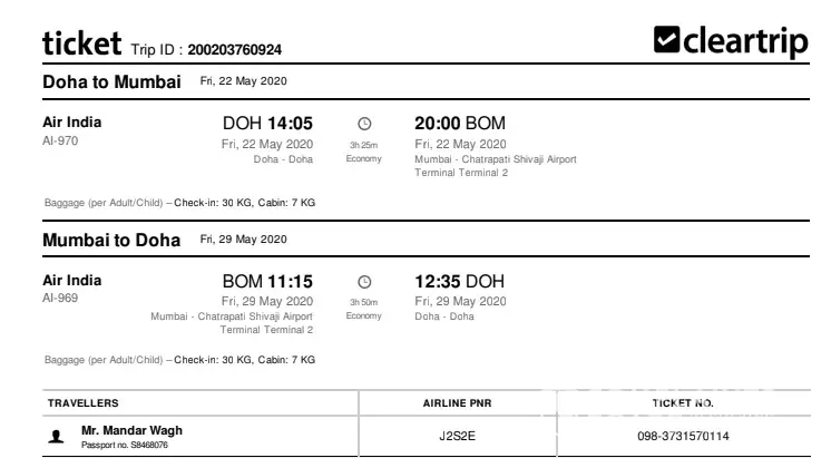 I had booked an air india flight ticket through cleartrip (trip id [protected]) from dubai to delhi on 17th march scheduled to fly on 24th march 2020 for aed 399.
